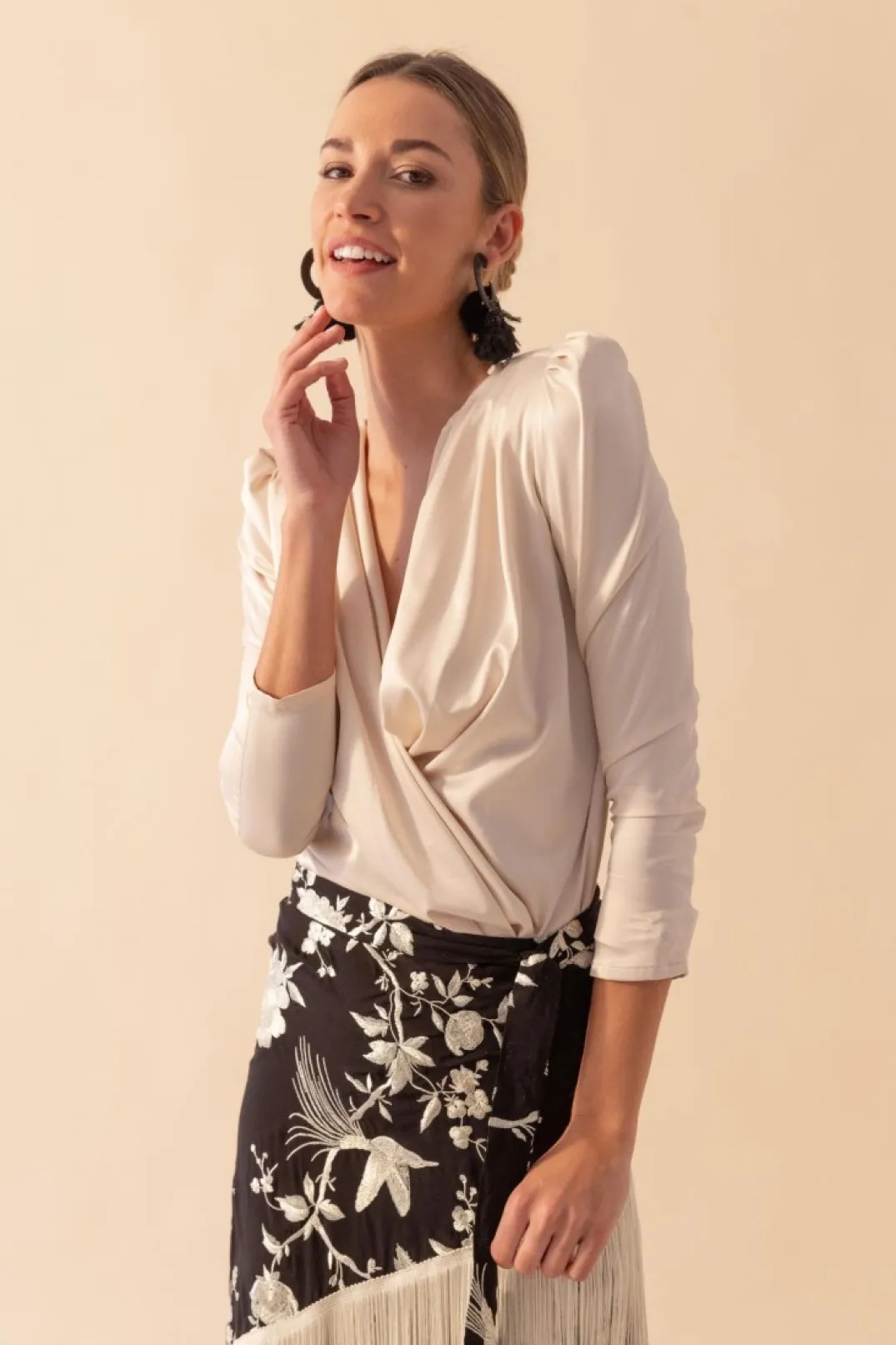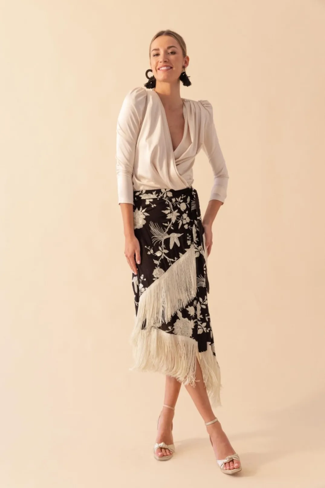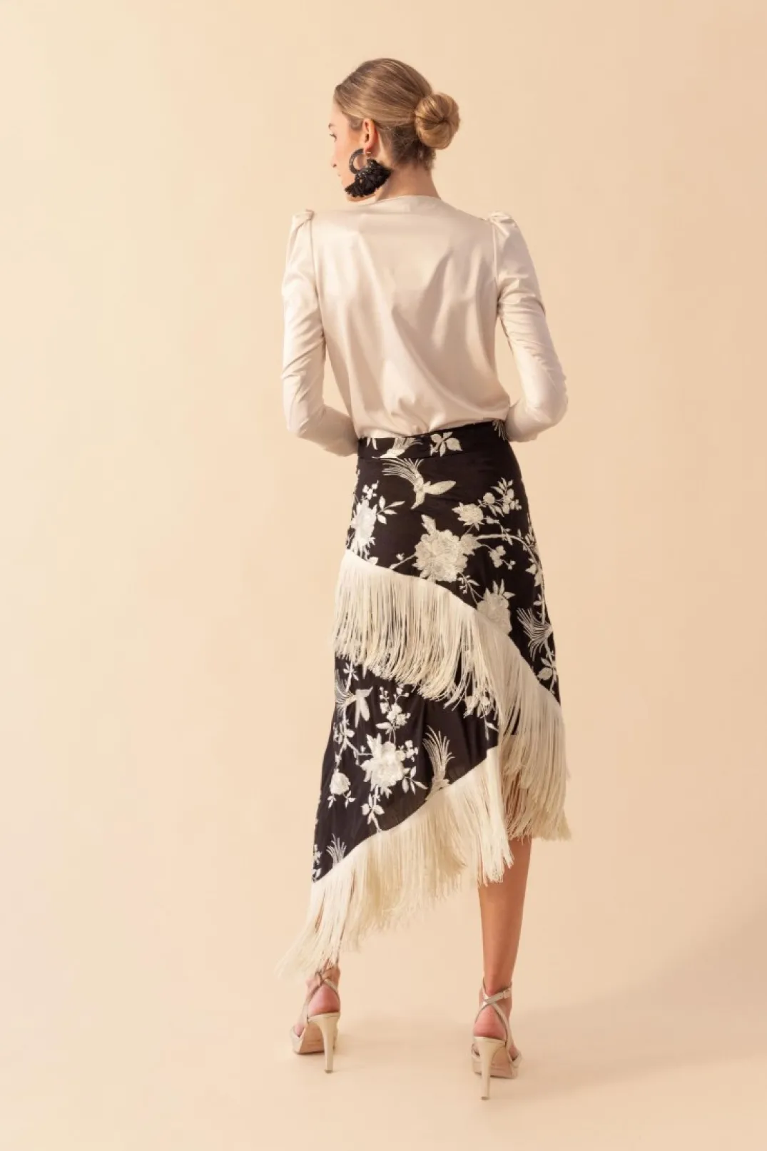 Falda de fiesta confeccionada en tejido bordado inspiración mantón de manila. Fondo negro con bordados color crudo. Largo asimétrico con flecos a tono con los bordados. Cierre lateral con cremallera invisible. Incluye fajín a tono. No lleva forro.