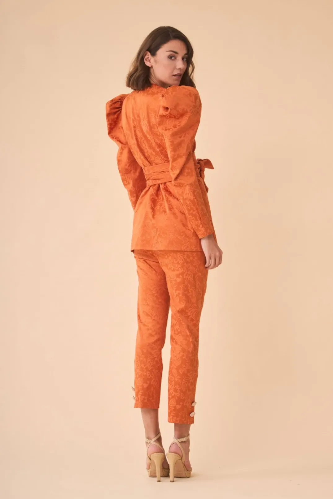 Chaqueta confeccionada en tejido jacquard terracota. Escote redondo y cierre delantero con pasamanería. Manga larga abullonada. Bolsillos laterales y forro a tono. Incluye fajín en el mismo tejido.