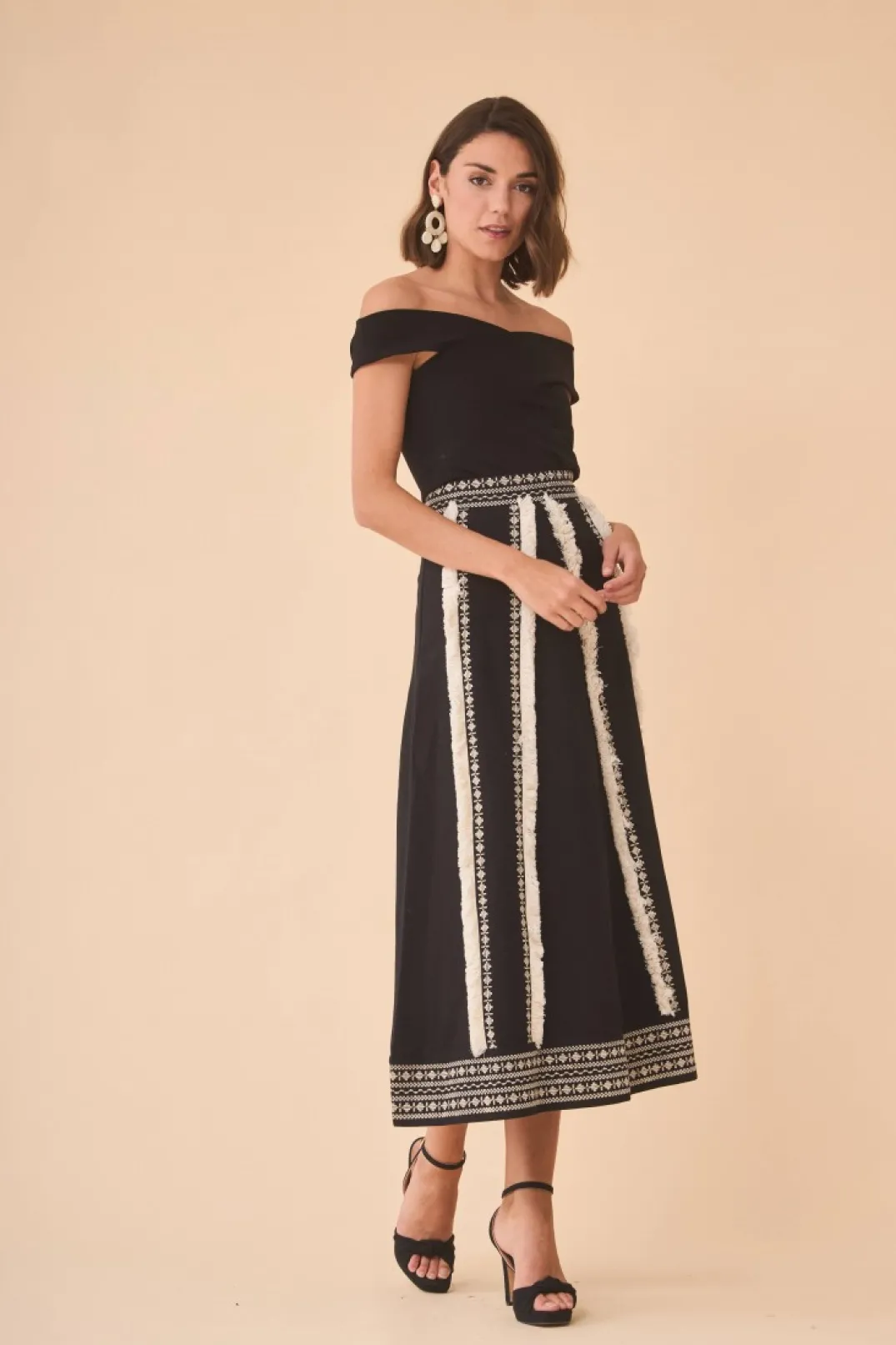 Falda midi de tiro alto confeccionada en algodón color negro. Detalle de flecos en la parte delantera y bordados en color beige en el bajo. Cierre con cremallera lateral invisible.