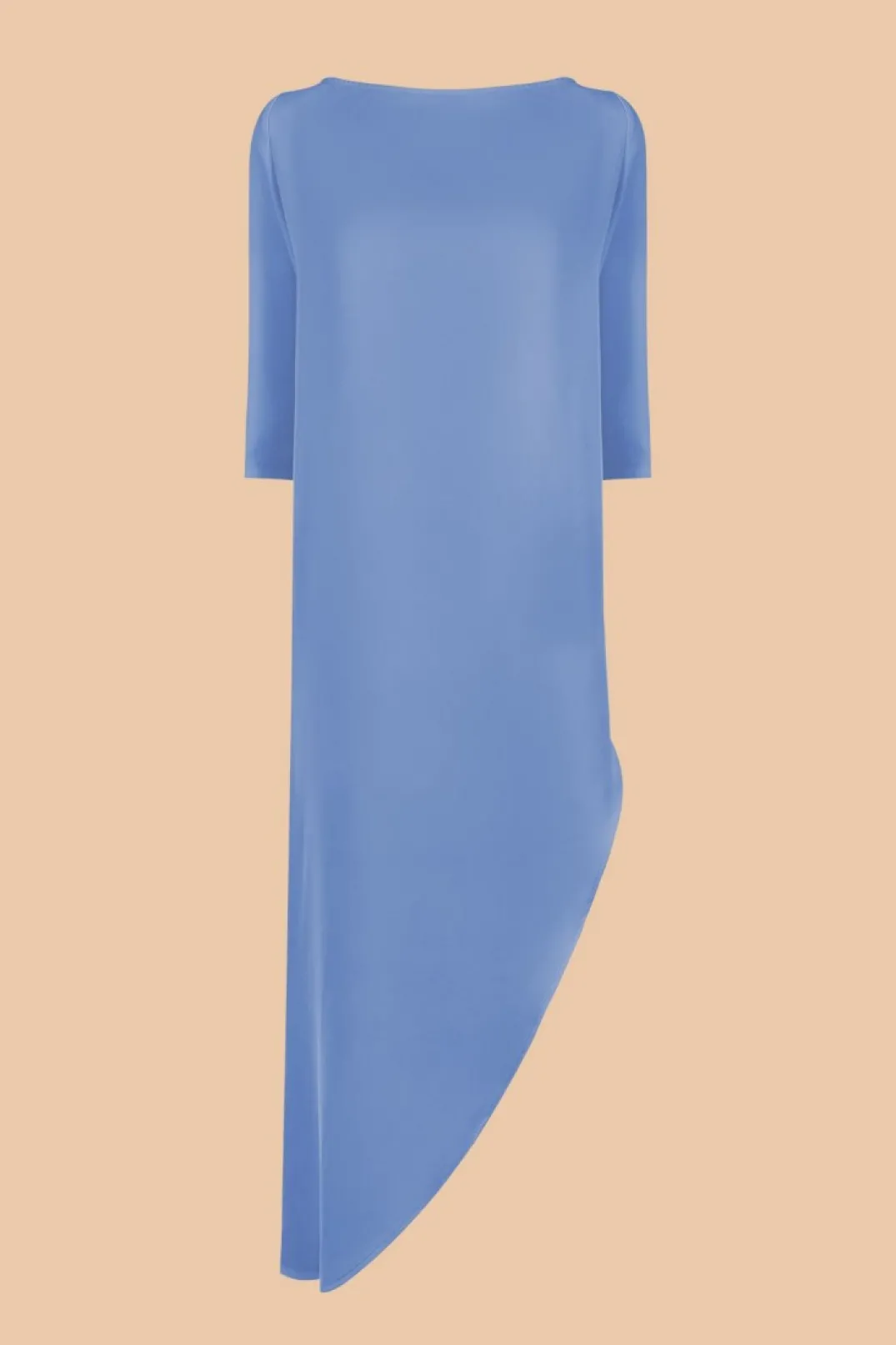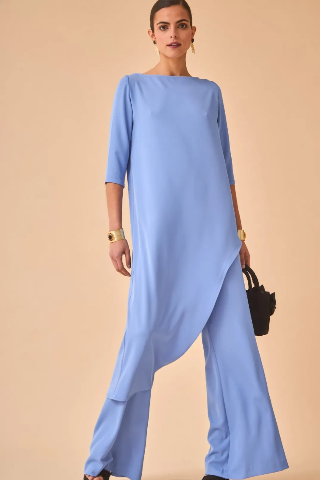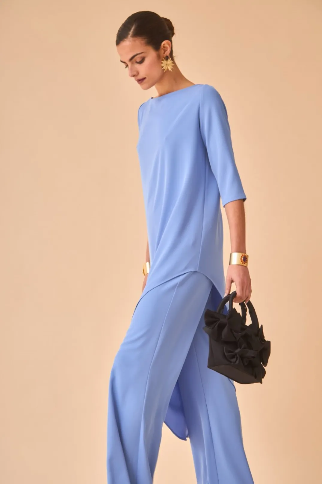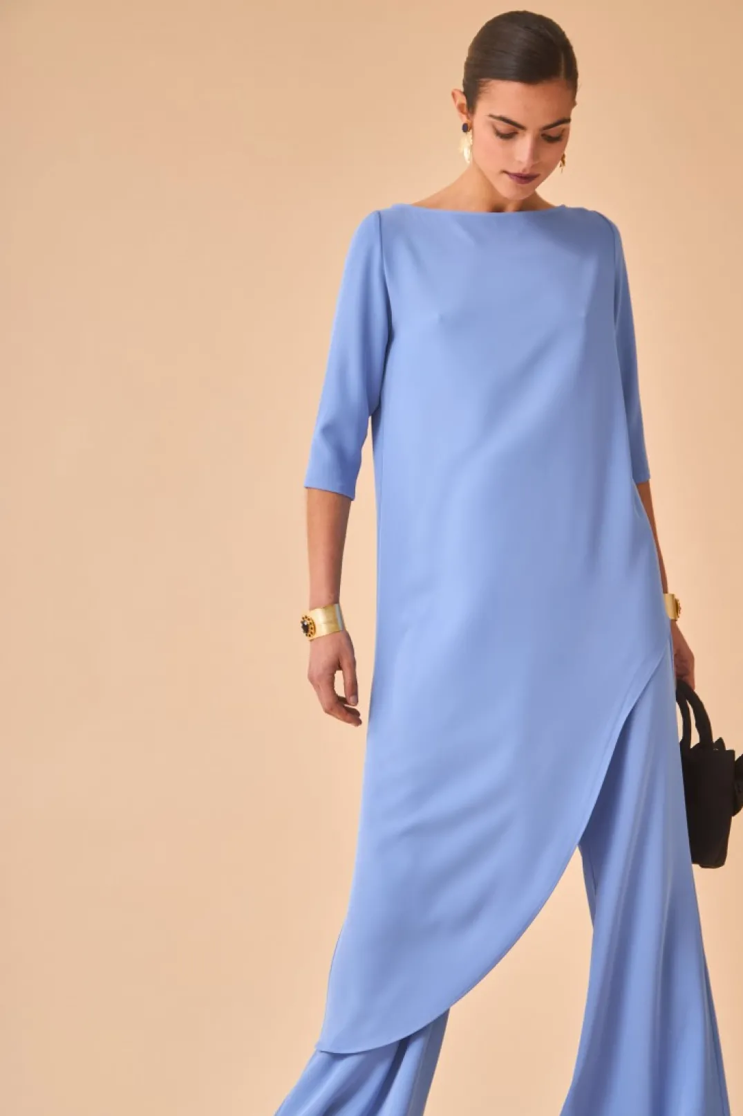 Top asimétrico confeccionado en crepé azul. Cuello barco y manga francesa. Largo asimétrico y corte amplio.