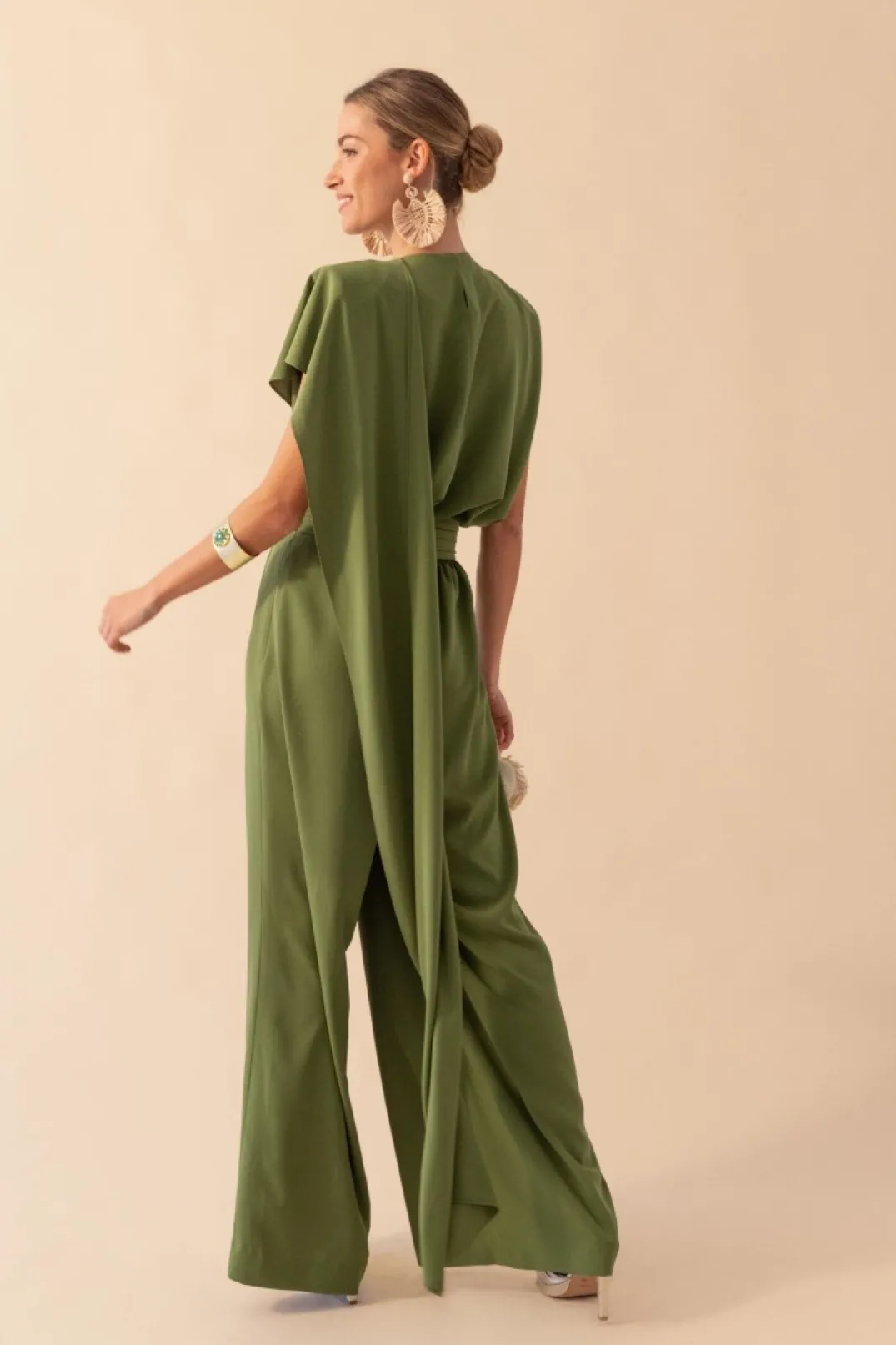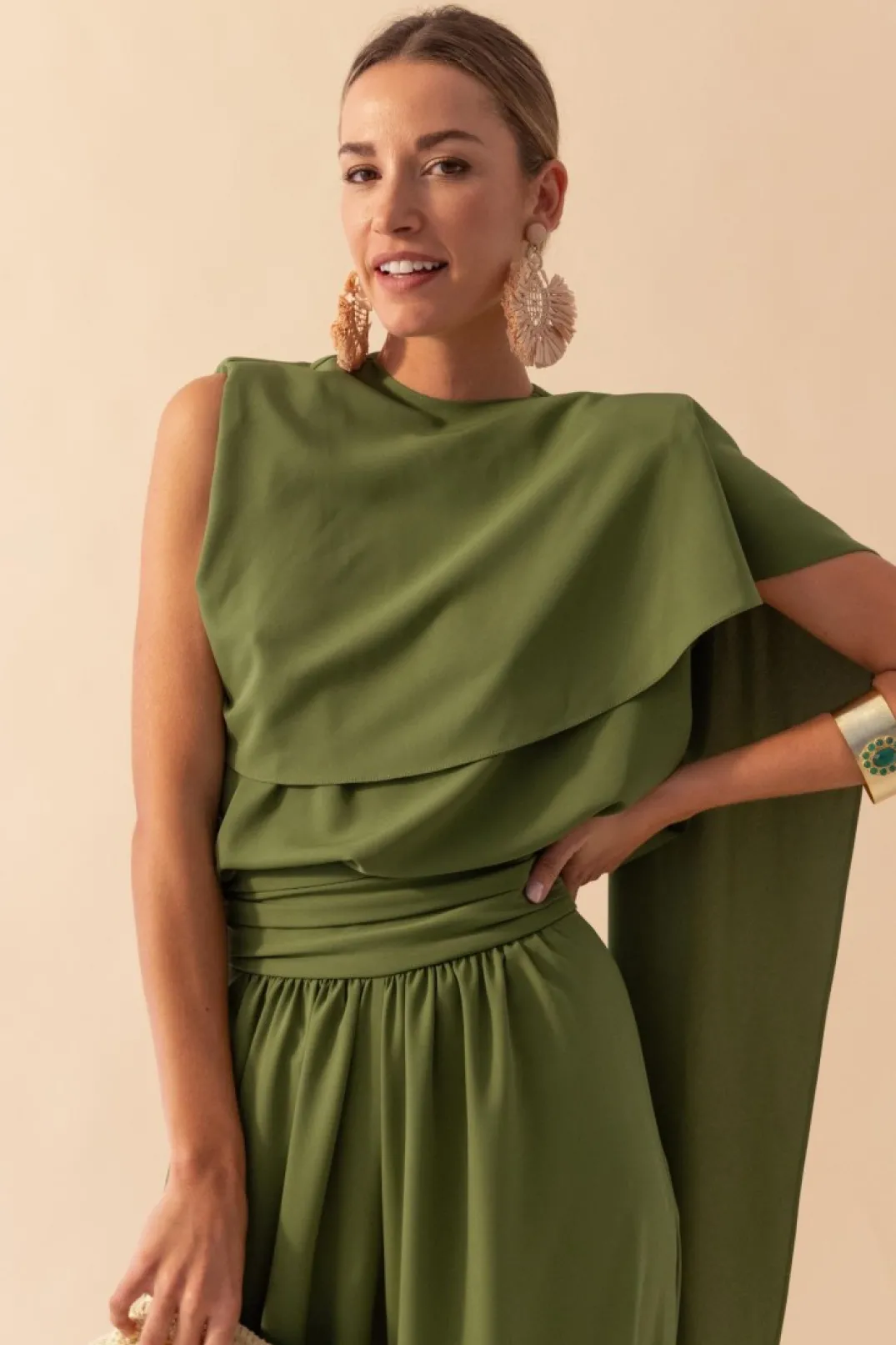 Top confeccionado en crepe color verde oliva. Cuello redondo con lazada multiposición y hombreras. Corte recto fluido.
