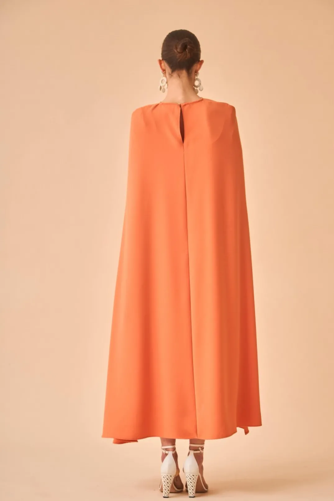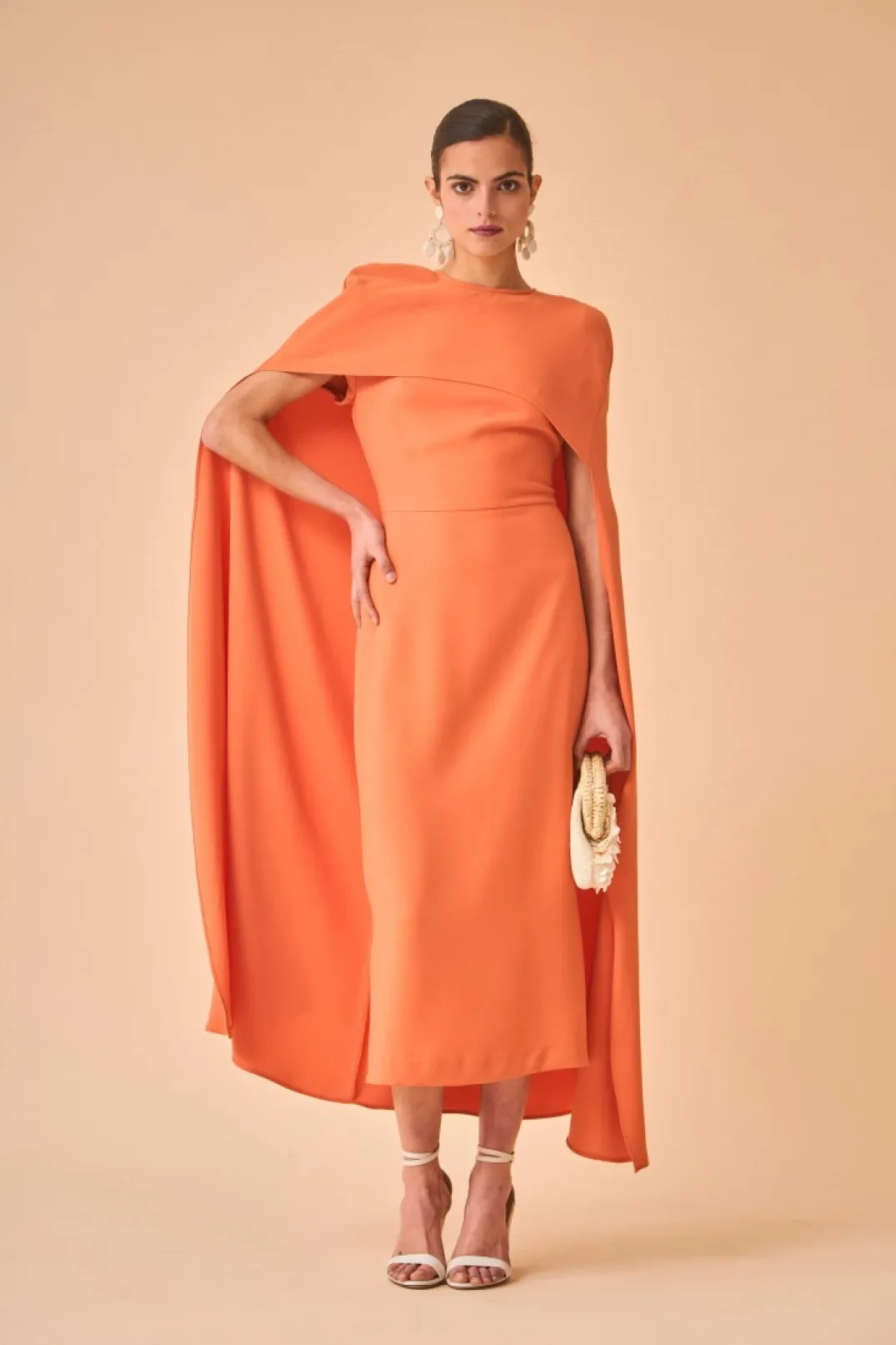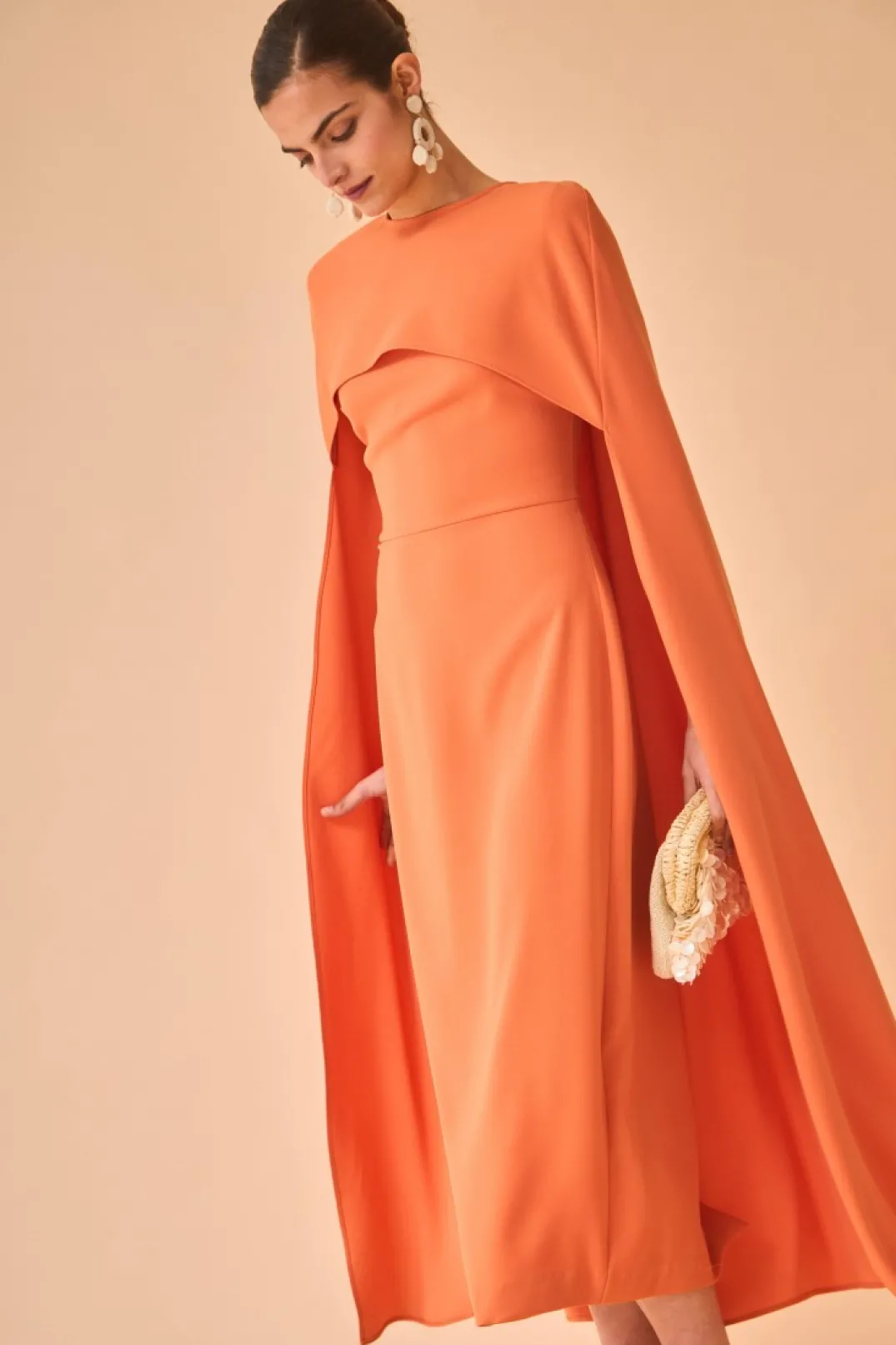 Vestido confeccionado en crepe naranja. Escote barco y manga corta. Corte en la cintura y falda recta con abertura trasera. Incluye capa en el mismo tono.