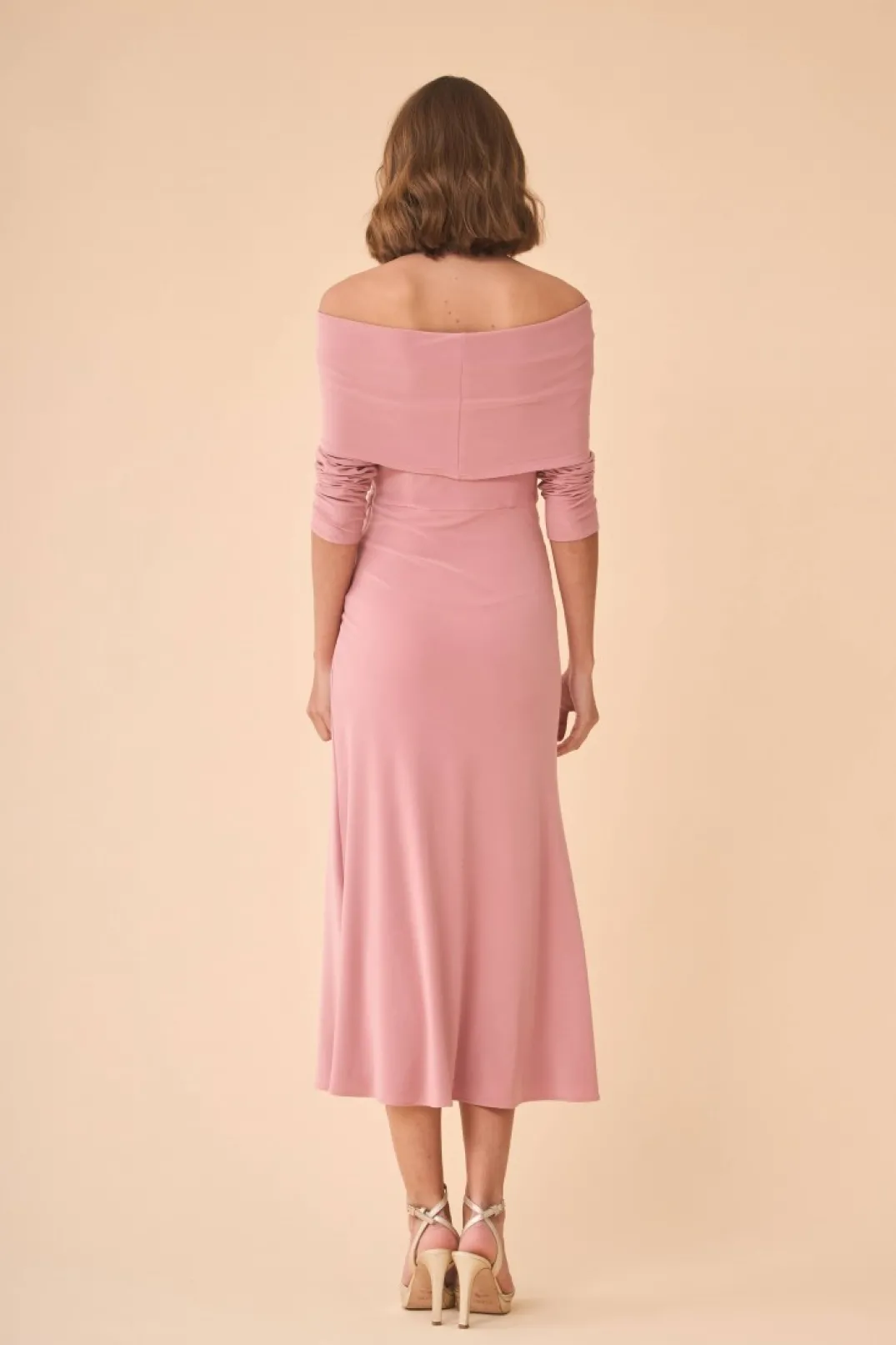 Vestido de fiesta midi confeccionado en tejido de punto color rosa. Corte en la cintura y falda fluida. Escote palabra de honor con manga larga.