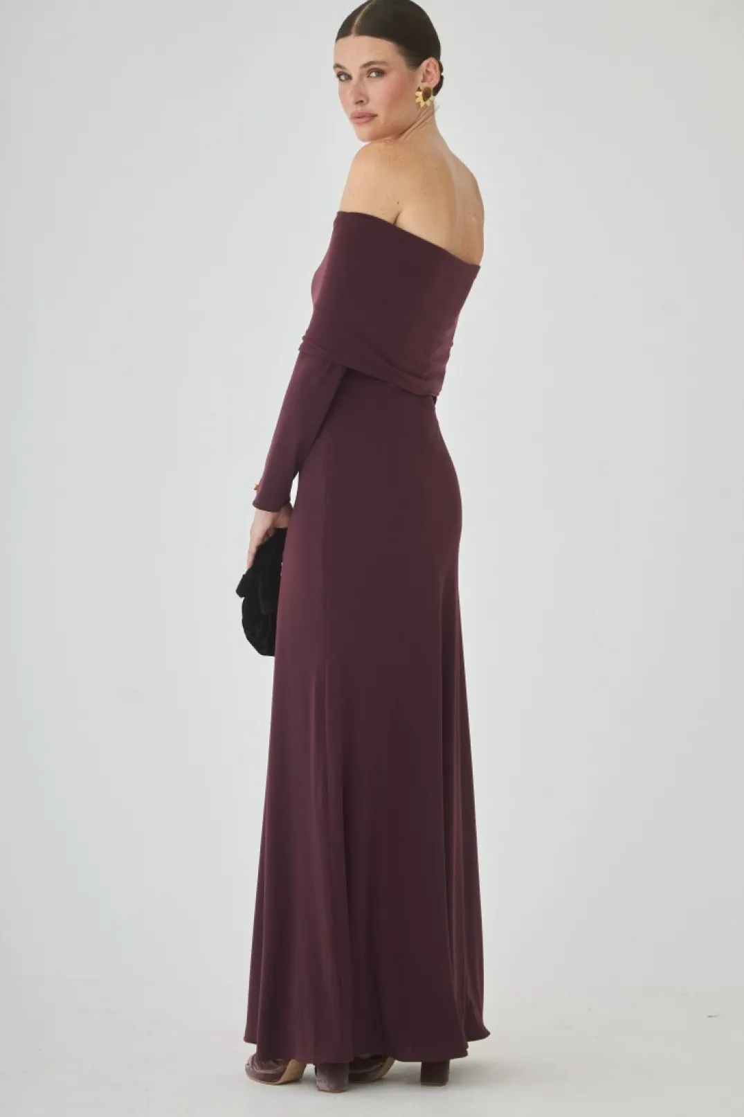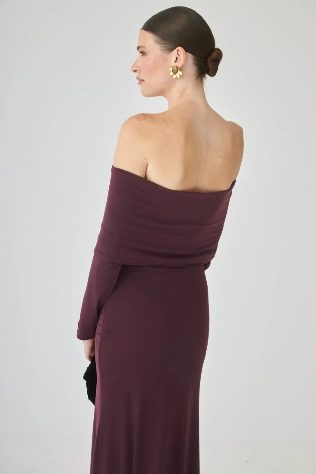Vestido de fiesta largo confeccionado en tejido de punto color granate. Corte en la cintura y falda fluida. Escote palabra de honor con manga larga.