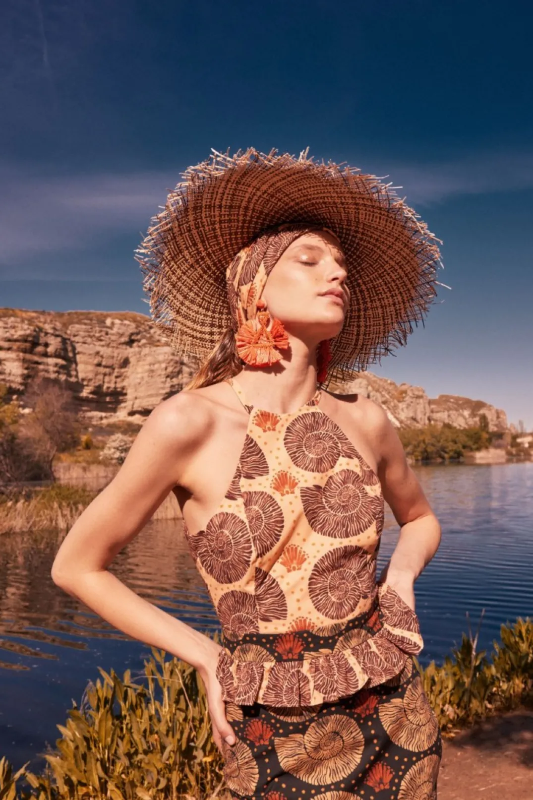 Top confeccionado en algodón estampado. Cuello halter con tirante fino. Cierre con cremallera trasera. Detalle de volante en el bajo.