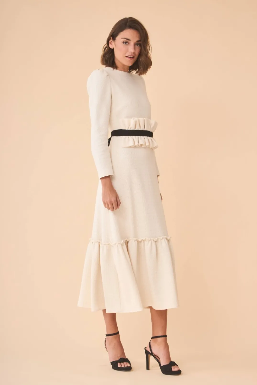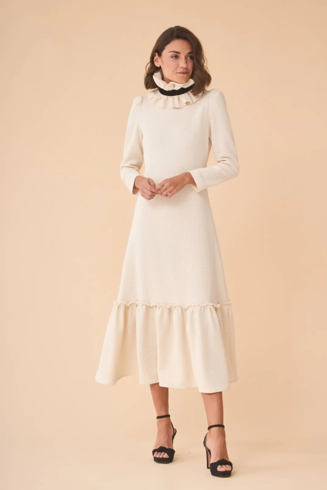 Vestido confeccionado en tweed color blanco. Cuello redondo y manga larga abullonada. Corte en la cintura y falda midi terminada en volante. Incluye maxi cuello adaptable con lazo de terciopelo negro, que también se puede colocar como fajín.