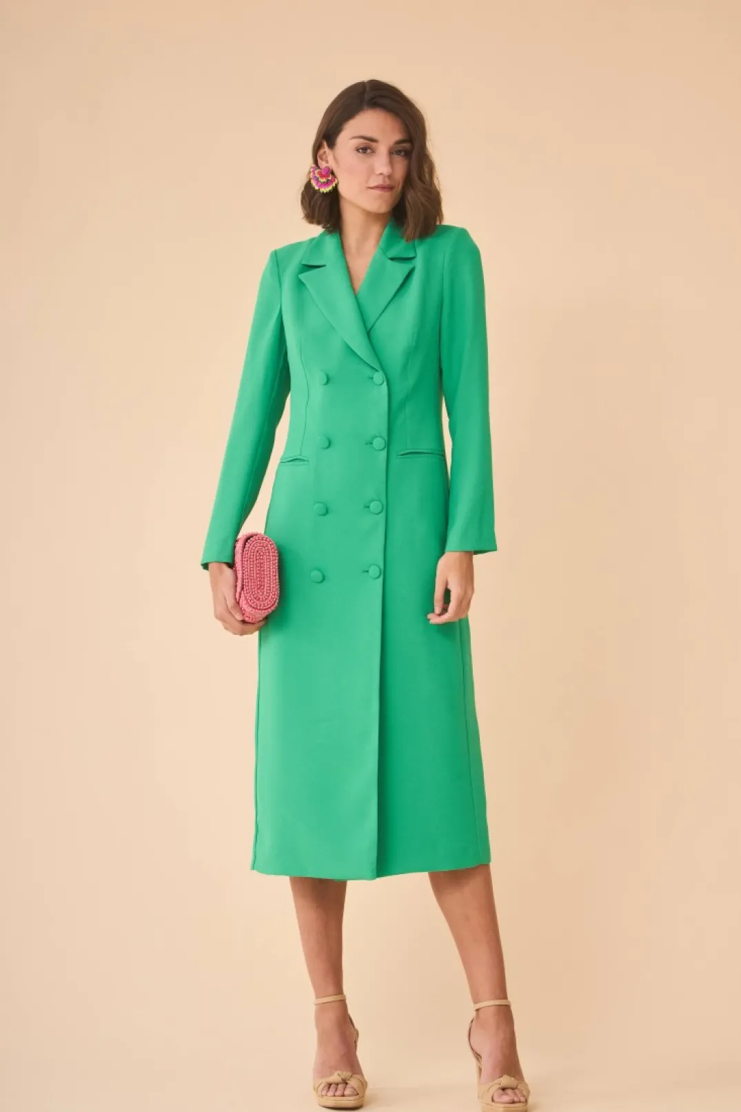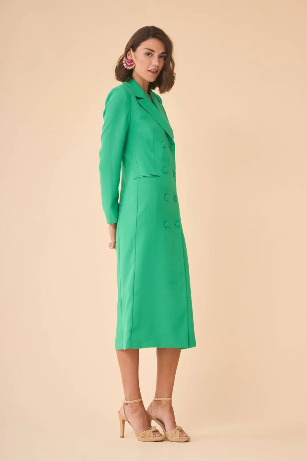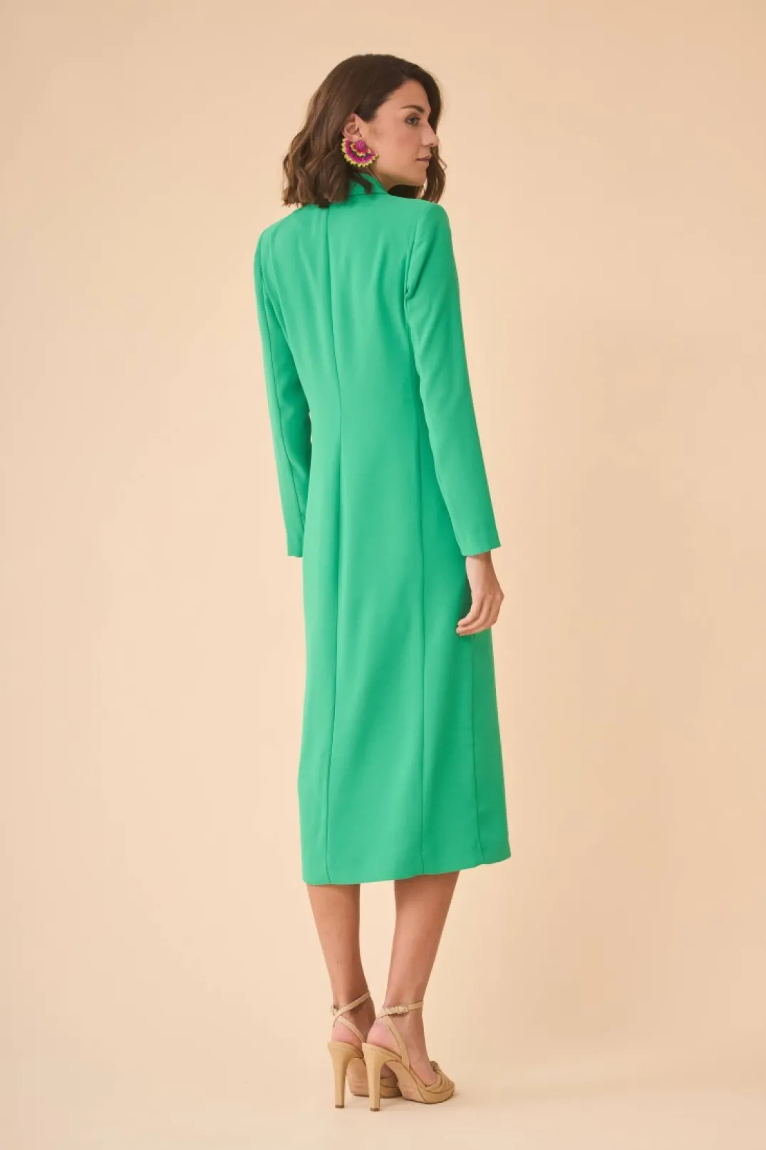 Vestido confeccionado en crepe color verde. Estilo blazer de largo midi. Escote en pico con solapas, manga larga y hombreras. Cierre delantero con botones forrados a tono.