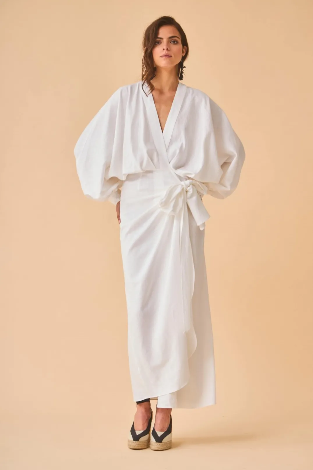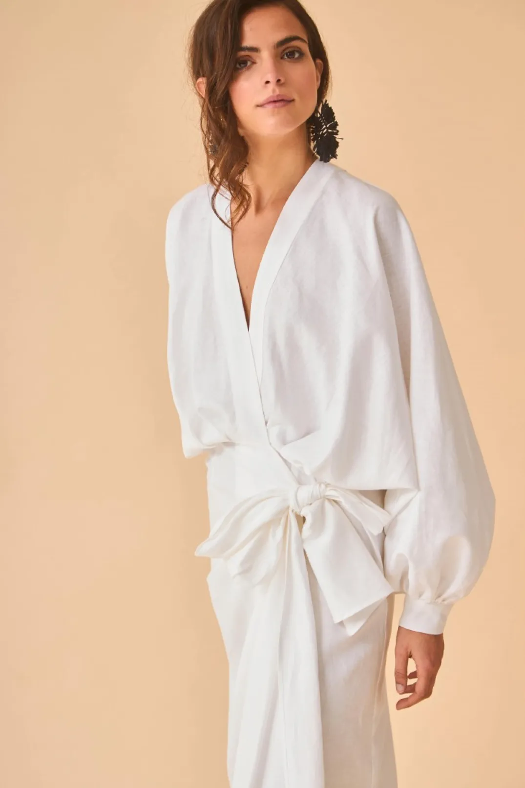 Vestido confeccionado en tejido mezcla lino color blanco. Escote en pico cruzado y manga abullonada, puños con botón a contraste estilo carey. Corte en la cintura y falda estilo pareo con lazada lateral.