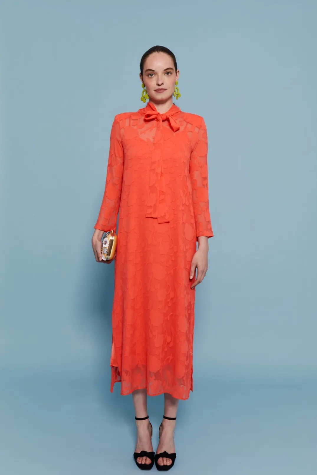 Vestido de fiesta dos piezas color coral flúor. Vestido interior de tirante fino confeccionado en tejido color coral y casaca confeccionada en gasa a tono. Cuello perkins con maxi lazada multiposición. Incluye hombreras forradas en el mismo tejido.
