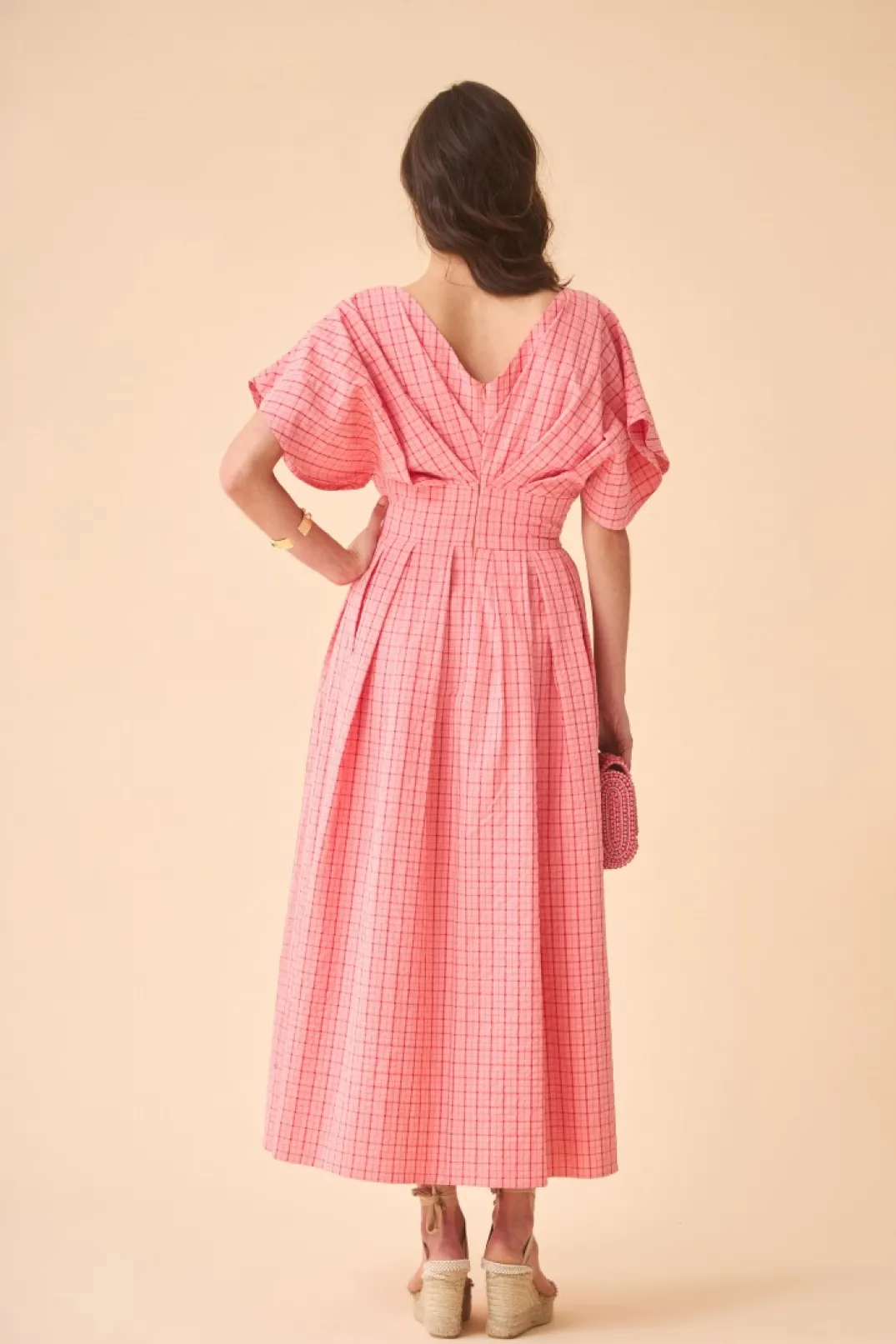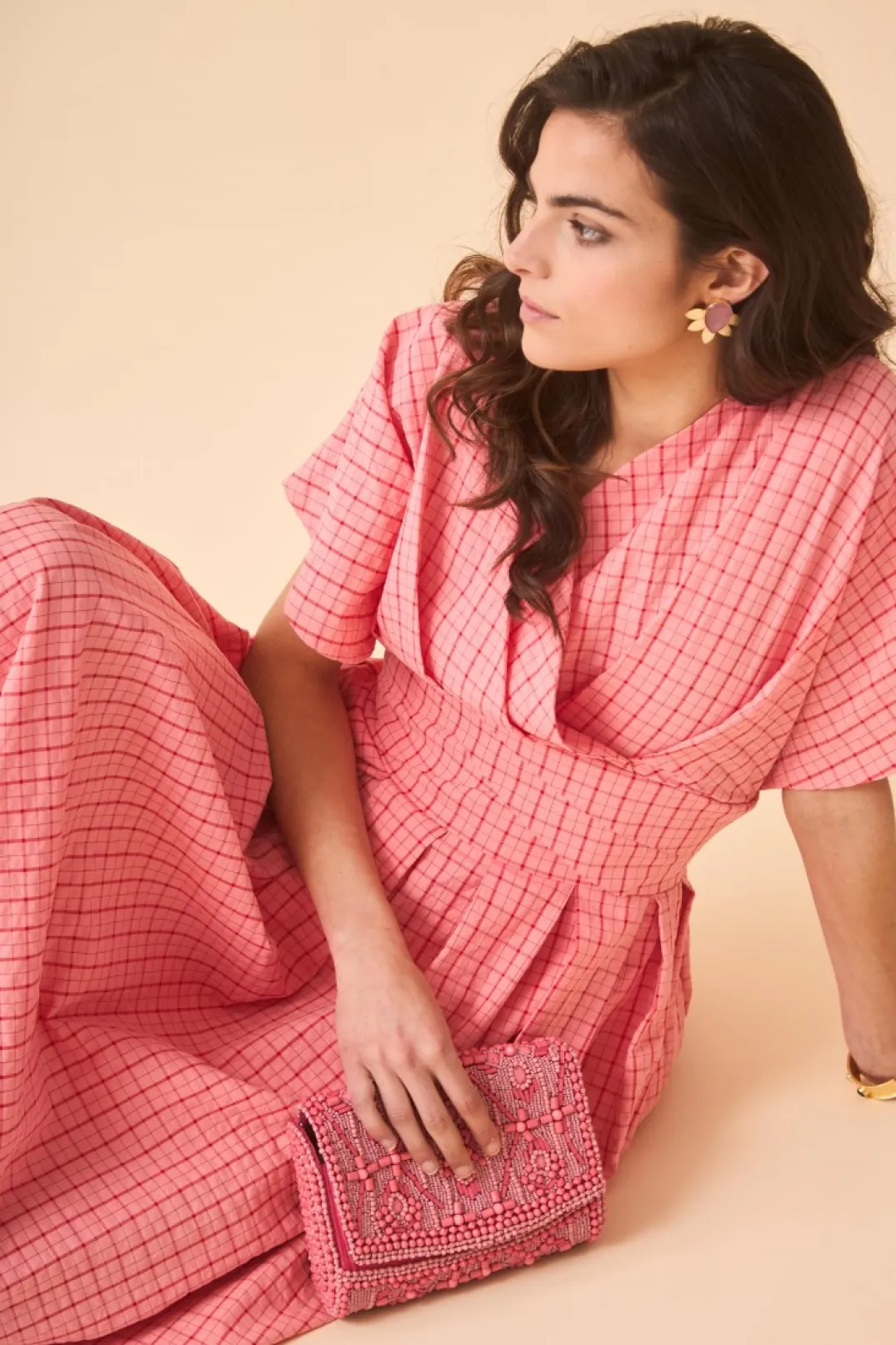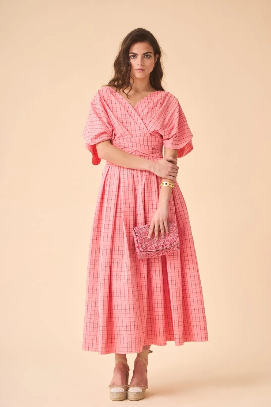 Vestido confeccionado en tejido de cuadritos rosa de algodón. Escote cruzado en pico y manga corta. Corte en la cintura con fajín confeccionado en el mismo tejido. Falda midi con vuelo. Cierre con cremallera invisible trasera.