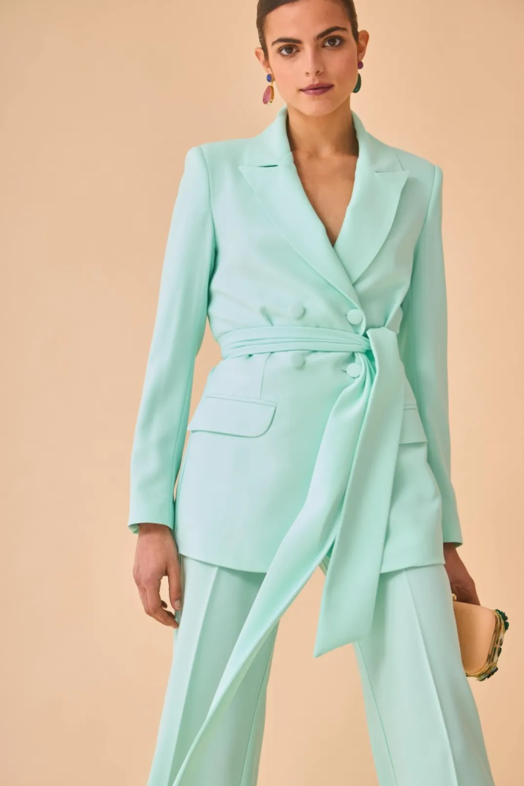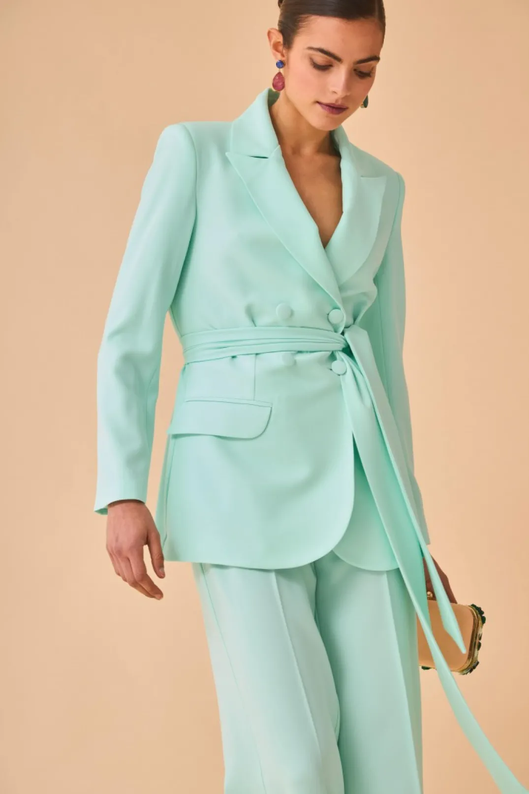 Blazer confeccionada en crepe mint. Corte entallado con hombreras y manga larga. Cierre frontal con botones forrados en el mismo tejido.