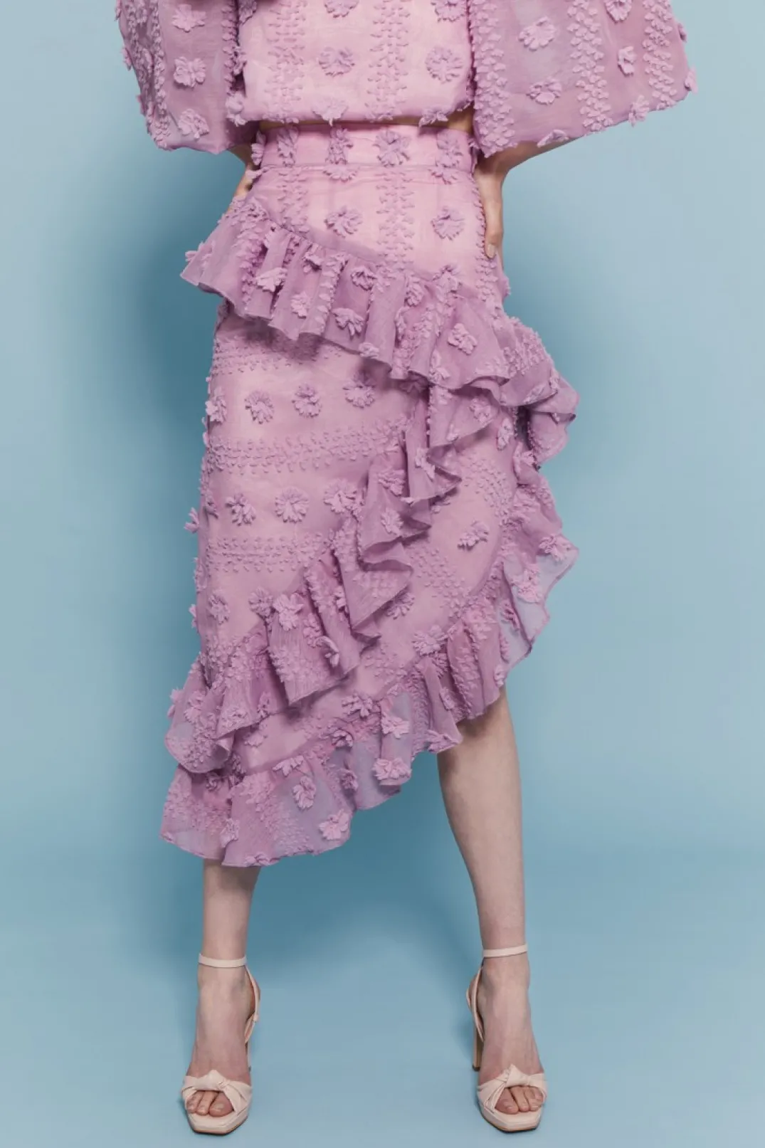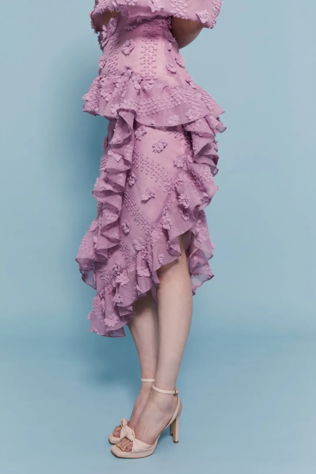 Falda de fiesta confeccionado en organza color malva con flores en el mismo tejido. Corte en la cintura y largo asimétrico con volantes. Cierre con cremallera invisible lateral
