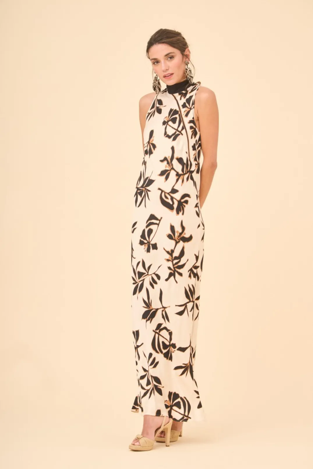 Vestido largo confeccionado en viscosa con estampado de flores. Cuello halter con contraste en color negro. Cierre trasero con lazada en el mismo tejido.
