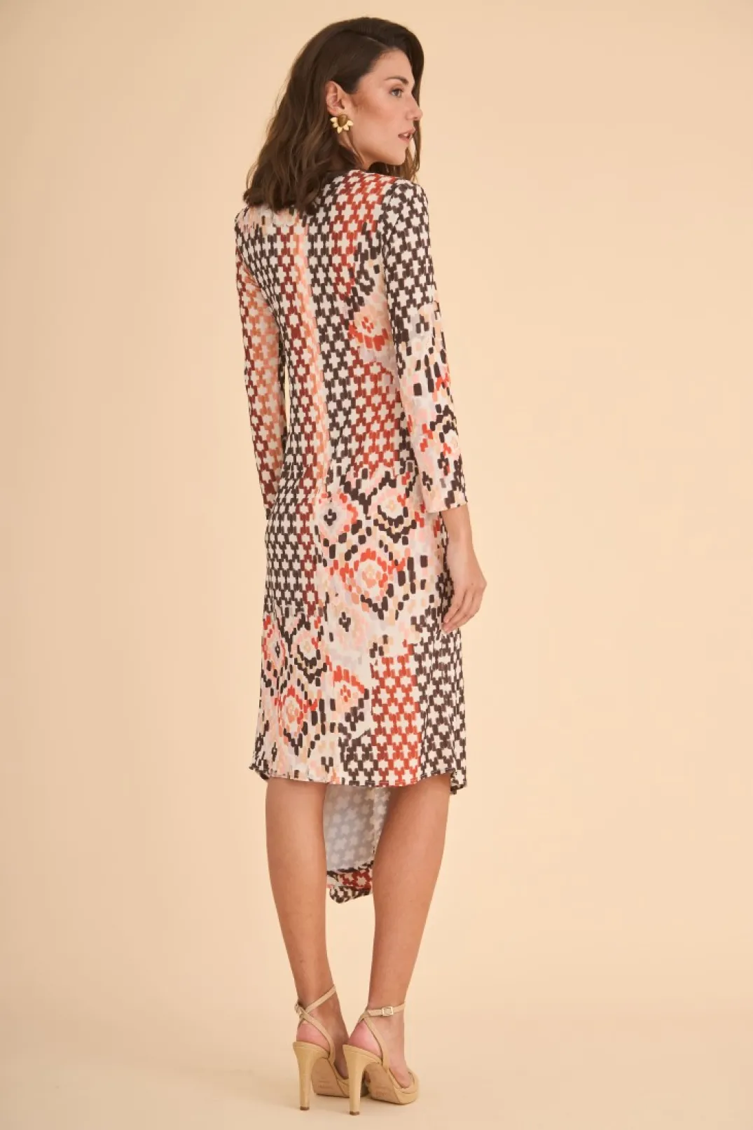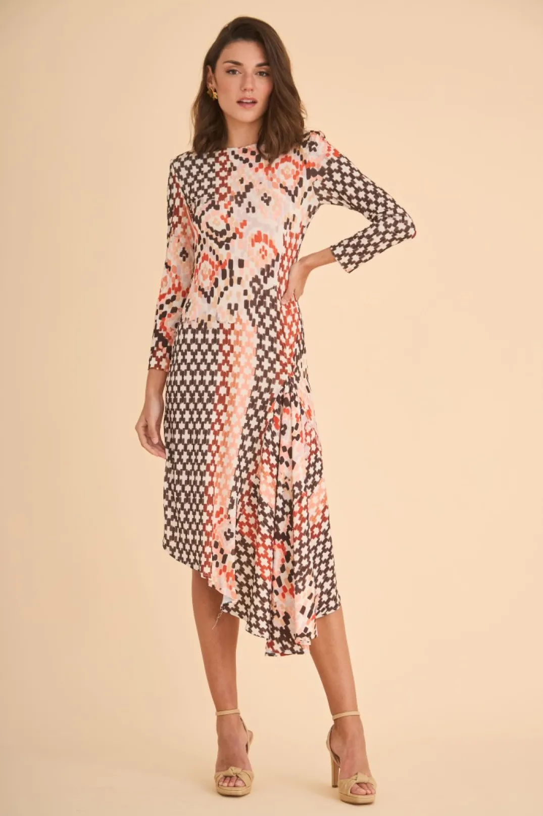 Vestido midi confeccionado en tejido de punto estampado con motivos étnicos. Cuello redondo y manga larga. Corte en la cintura y largo asimétrico con drapeado lateral en la falda. Cierre con cremallera trasera invisible.