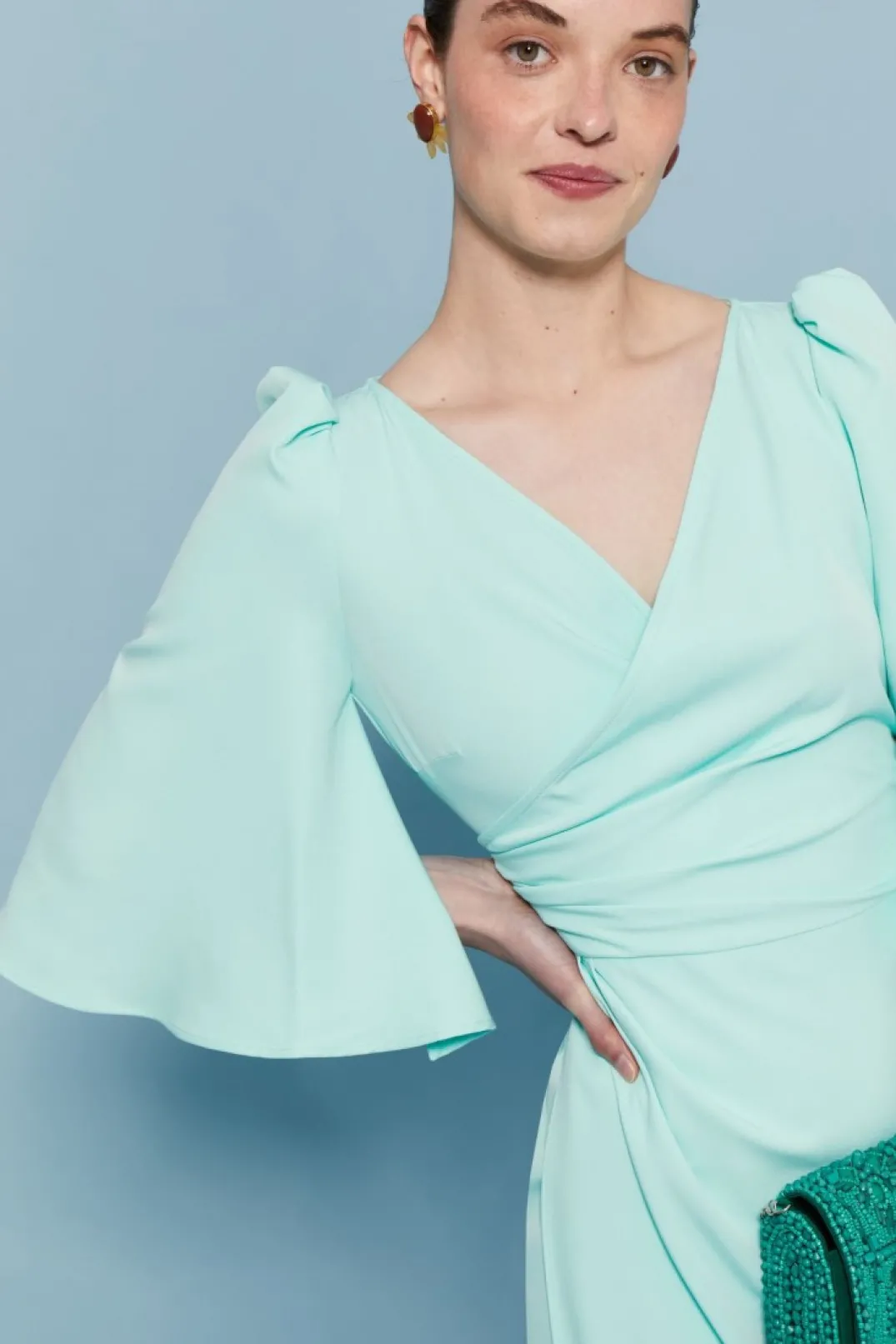 Vestido midi de fiesta confeccionado en crepe aguamarina. Escote cruzado terminado en drapeado a la cintura. Manga estilo mariposa.