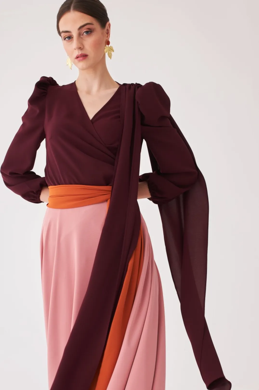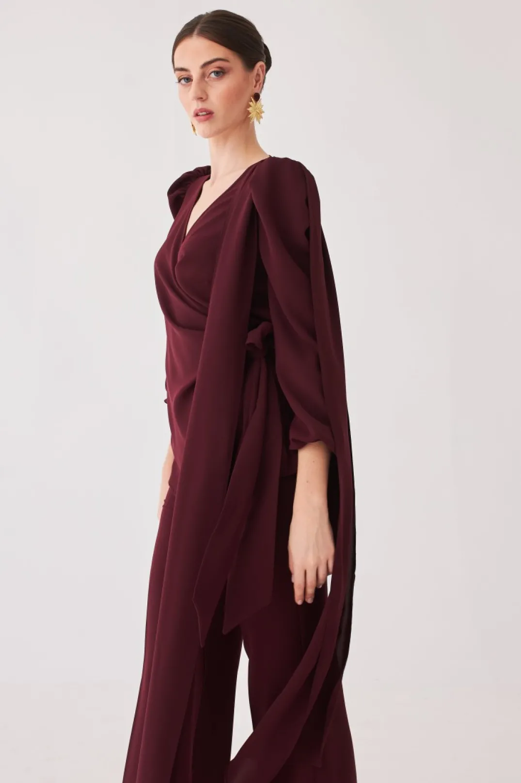 Top confeccionado en crepe color burdeos. Manga francesa abullonada con efecto capa delantero y trasero. Escote cruzado y cierre lateral con lazada a tono.