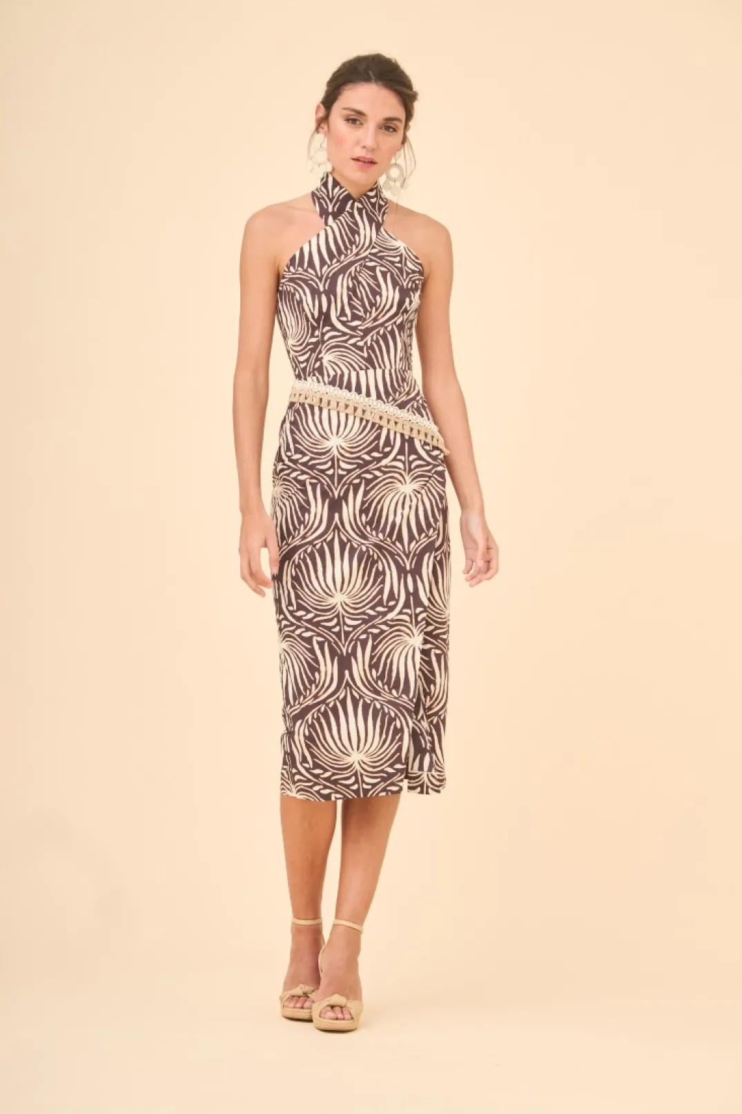 Falda estilo tulipa confeccionada en algodón estampado estilo animal print. Largo midi, corte en la cintura con pasamanería de rafia y abertura delantera. Cierre con cremallera invisible trasera.