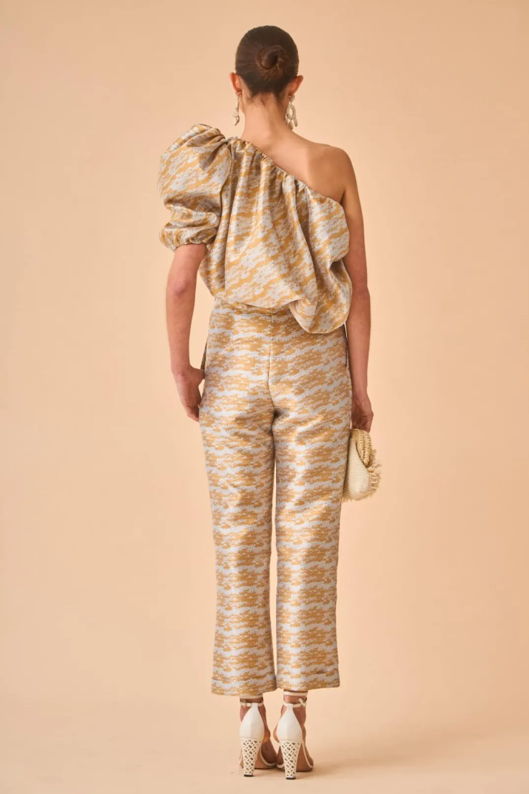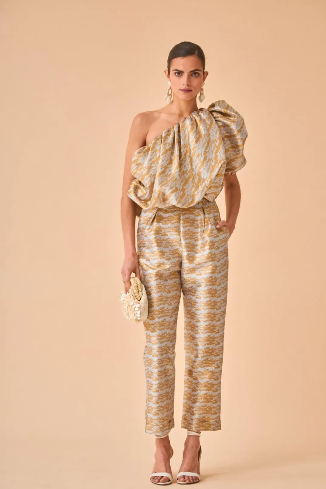 Pantalón confeccionado en tejido metalizado. Tiro alto y corte recto con bolsillos laterales. Consigue un total look perfecto y super original combinándolo con nuestro top Aarte.