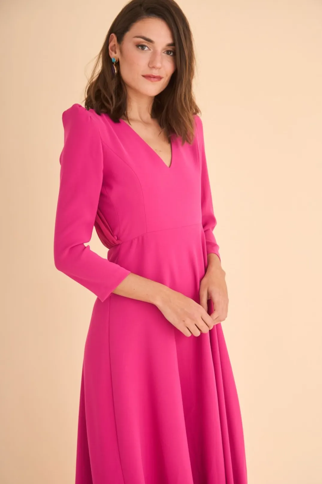 Uno de nuestros iconos esta colección. Vestido midi confeccionado en crepe color fucsia. Escote en pico y manga francesa abullonada. Corte en la cintura y falda fluida. Escote en espalda con drapeado confeccionado en gasa de seda, haciendo de nuestro vestido Fiore una pieza super especial.