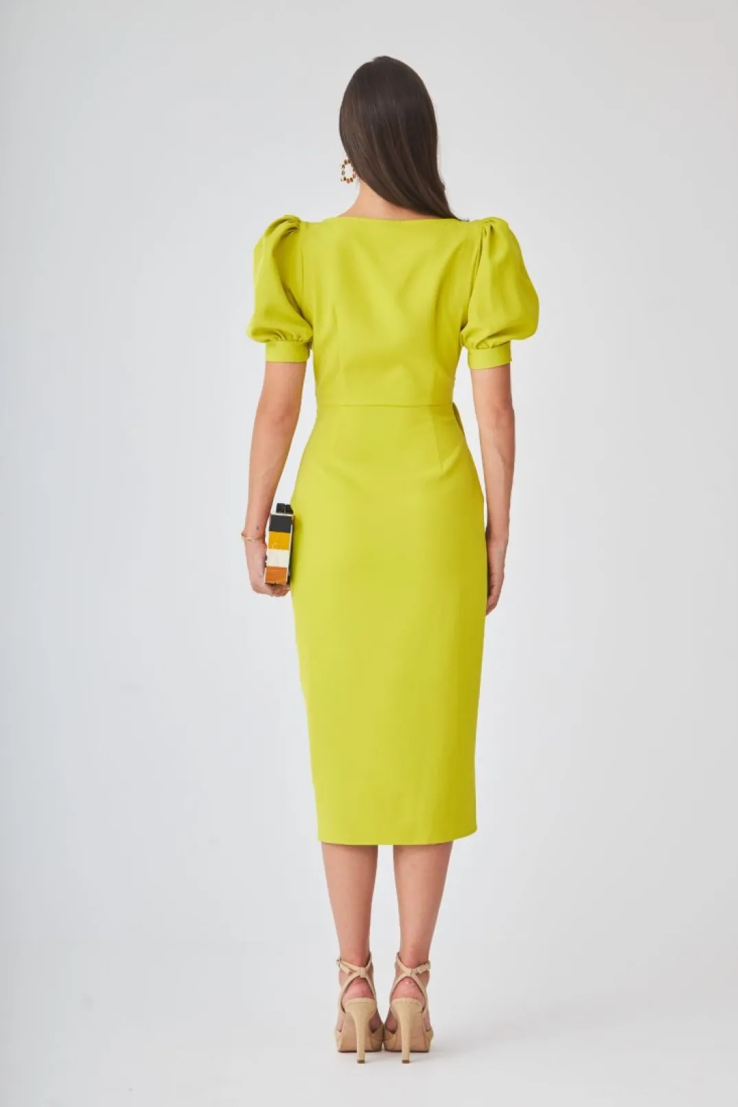 Vestido de fiesta confeccionado en crepe oliva. Escote cruzado terminado en fruncido a la cintura. Manga corta abullonada. Falda estilo tulipa.