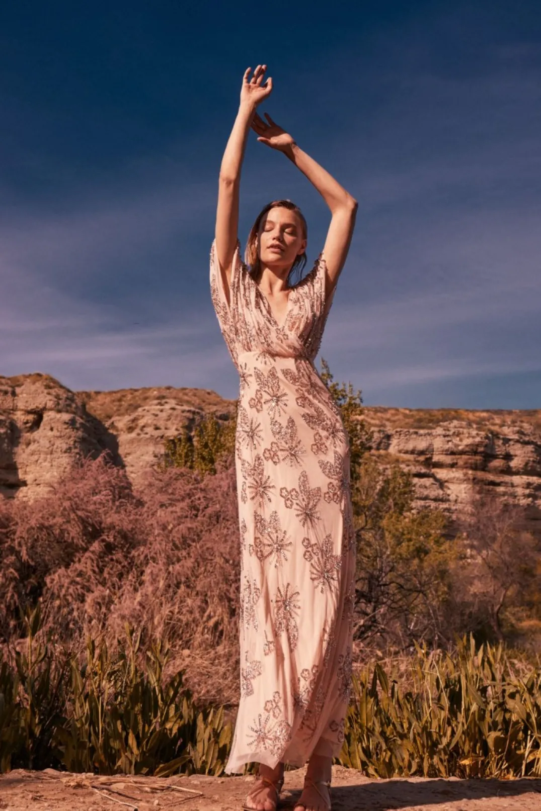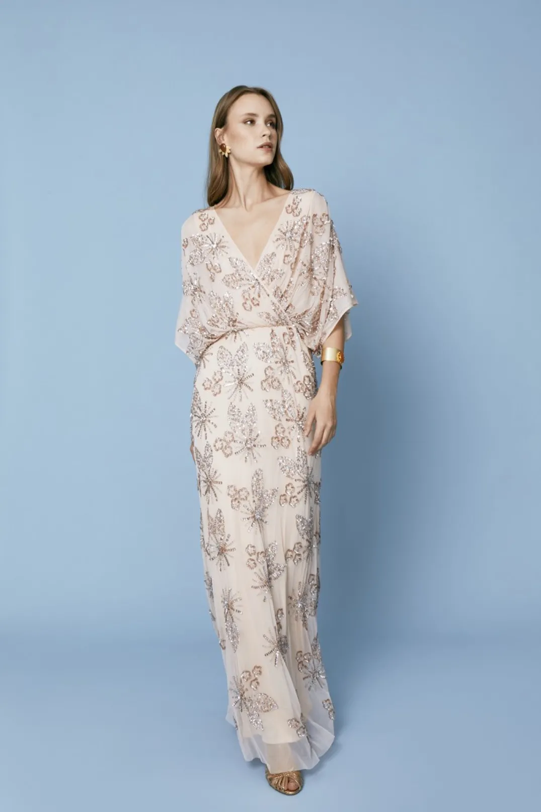 Vestido largo de fiesta con lentejuelas. Confeccionado en un tono rosa suave, este vestido presenta un escote en pico cruzado que aporta un toque de elegancia y modernidad. Las mangas cortas y sueltas ofrecen comodidad y un estilo relajado. El diseño está adornado con lentejuelas bordadas en patrones florales, creando un efecto romántico y original. La falda fluida cae suavemente hasta el suelo, ofreciendo un movimiento elegante y cómodo, perfecto para bailar toda la noche.