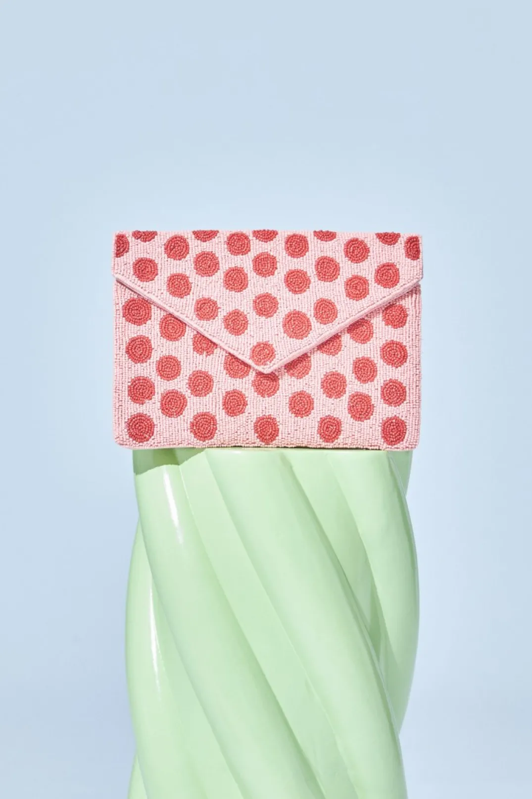 Cartera de pedrería estilo sobre inspiración lunares en tonos rositas y rojo.