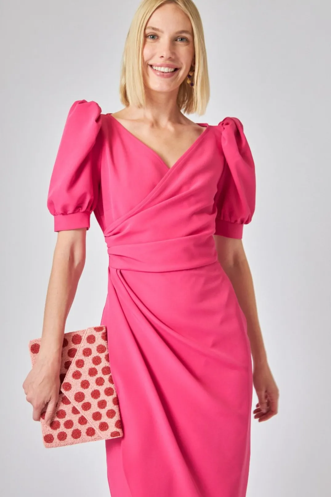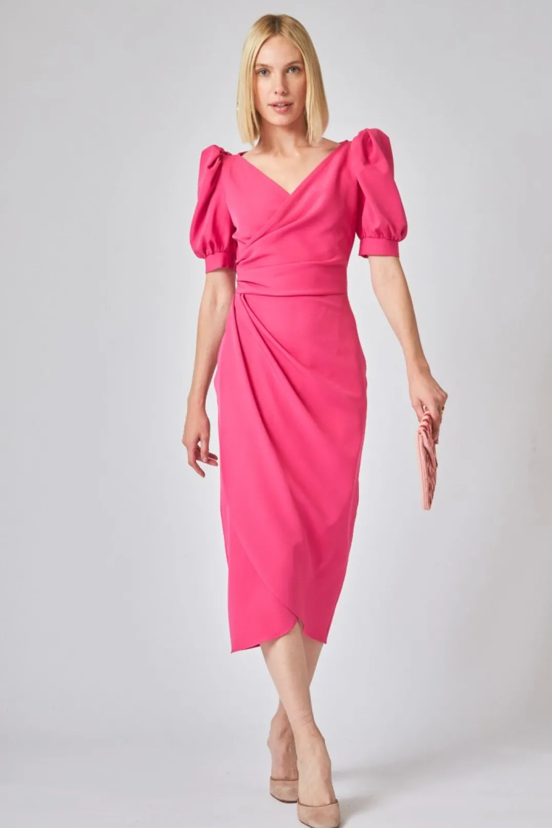 Vestido de fiesta confeccionado en crepe fucsia. Escote cruzado terminado en fruncido a la cintura. Manga corta abullonada. Falda estilo tulipa.
