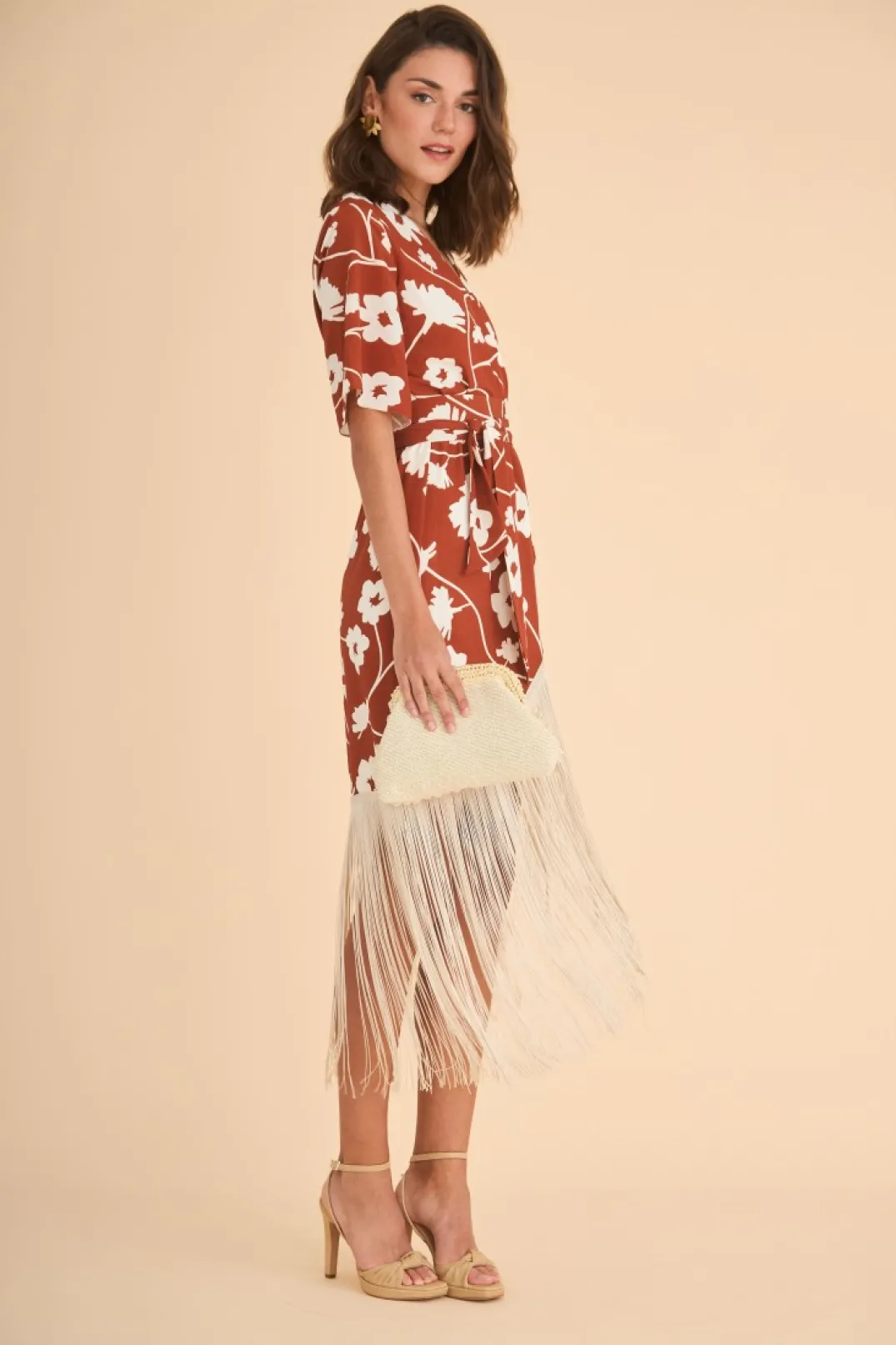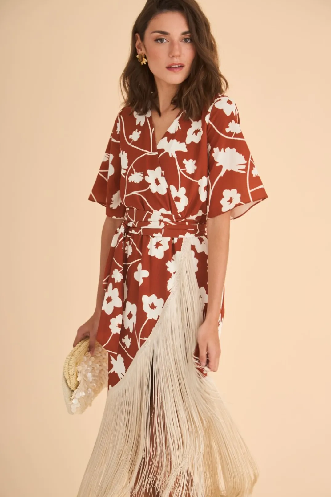 Vestido de fiesta confeccionado en tejido satinado en tono marrón. Escote cruzado y corte a la cintura con cinturón. Manga corta. Falda estilo pareo con flecos y forro a tono.