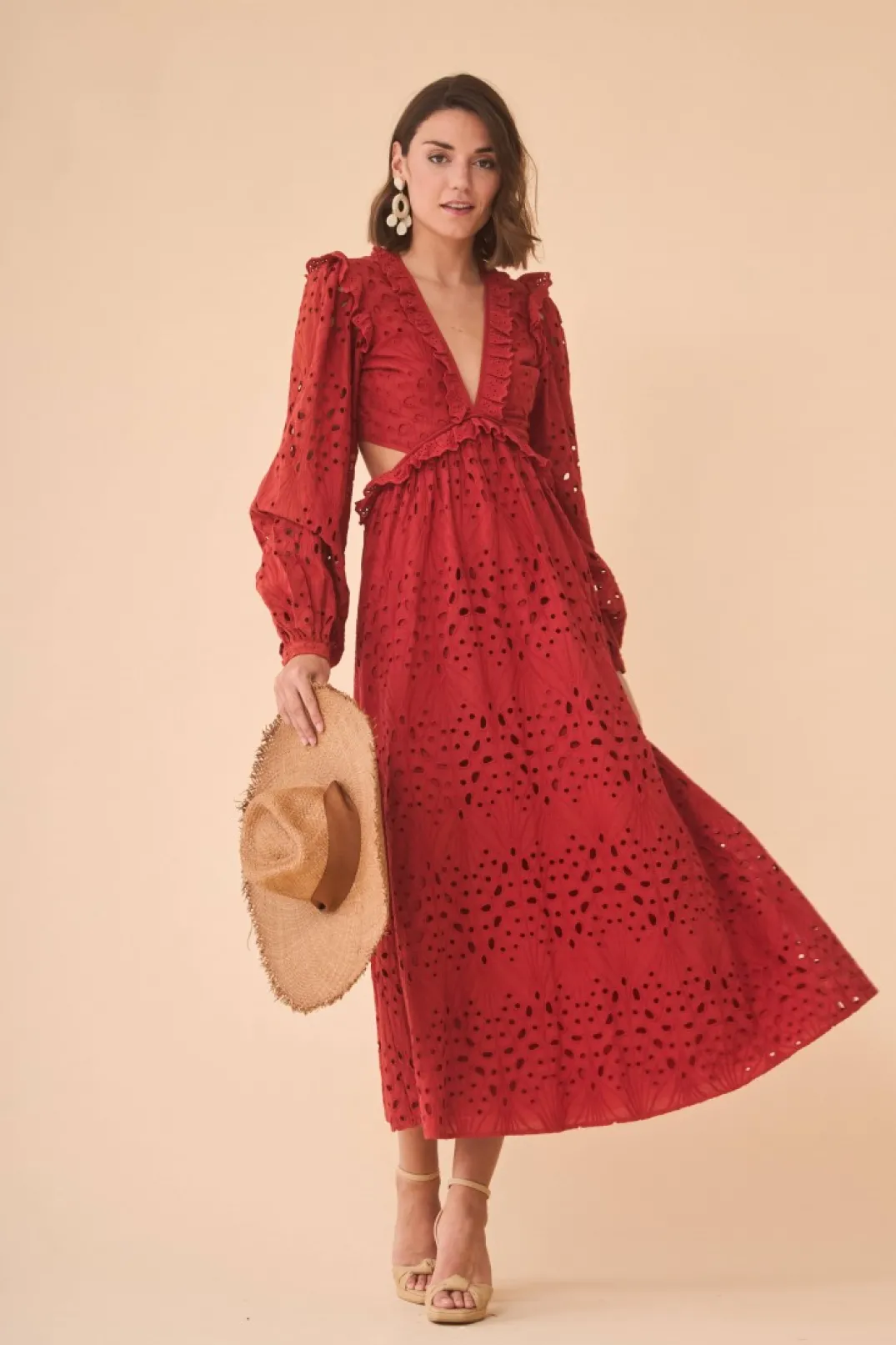 Vestido confeccionado tejido troquelado en color teja. Escote en pico con mini volante y manga larga abullonada con elástico en el puño. Corte cut-out y falda midi con vuelo. Cierre con cremallera invisible lateral.