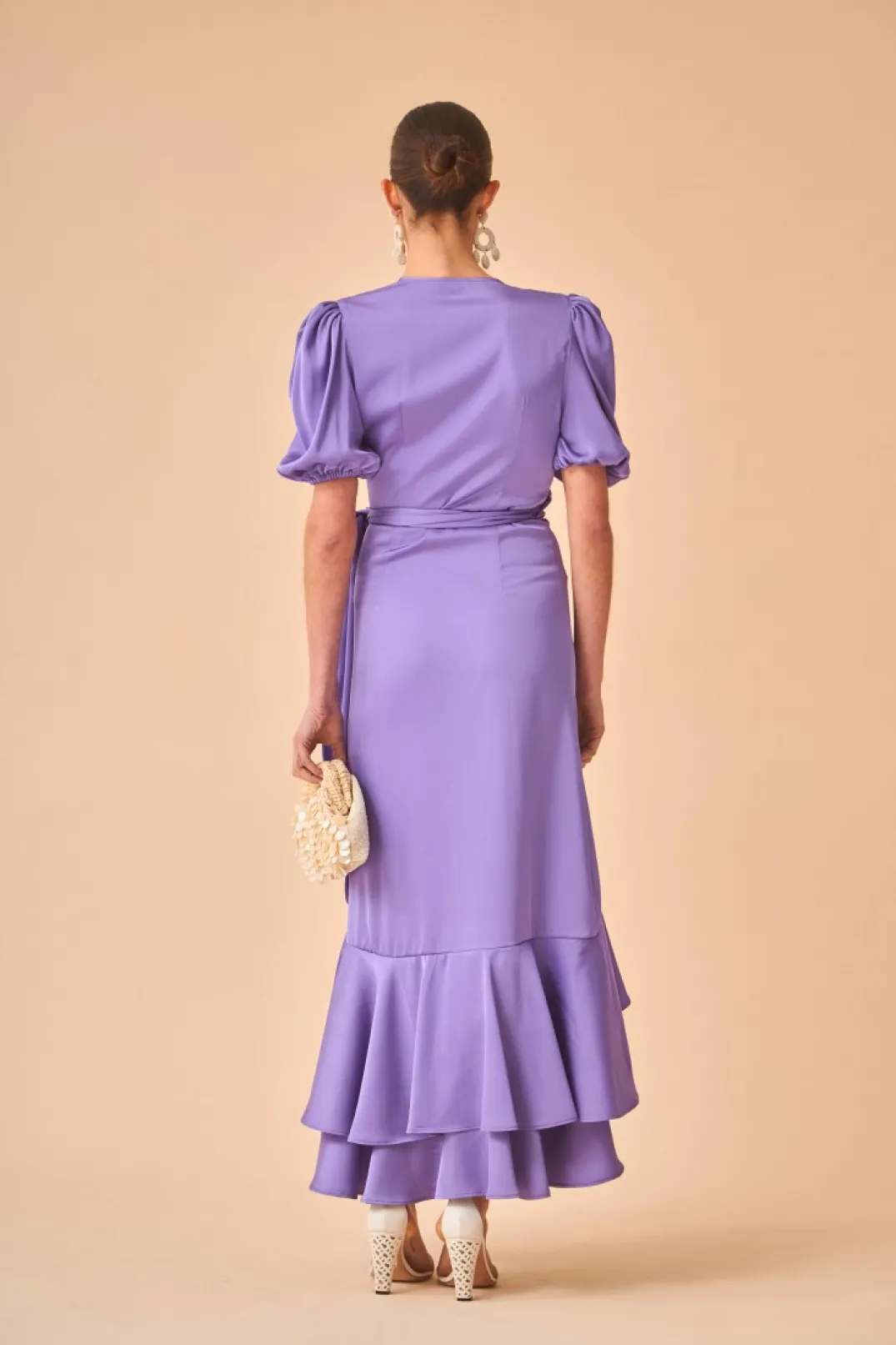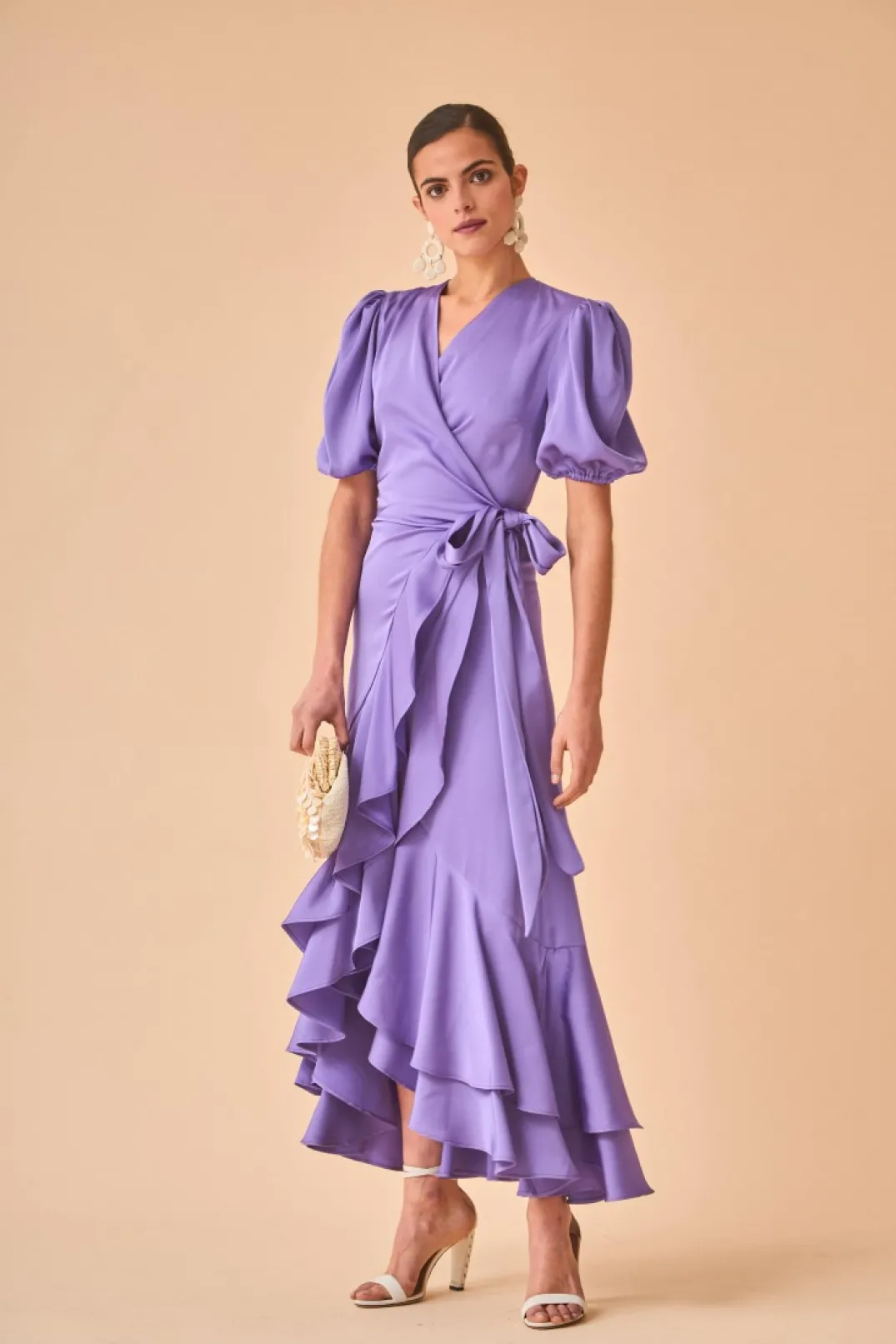 Vestido de fiesta confeccionado en satén color lila. Escote en pico cruzado y manga corta abullonada con elástico. Falda estilo pareo con doble volante.