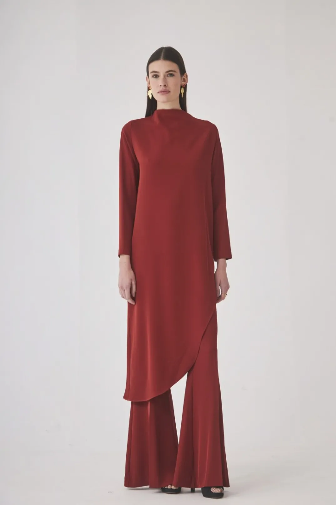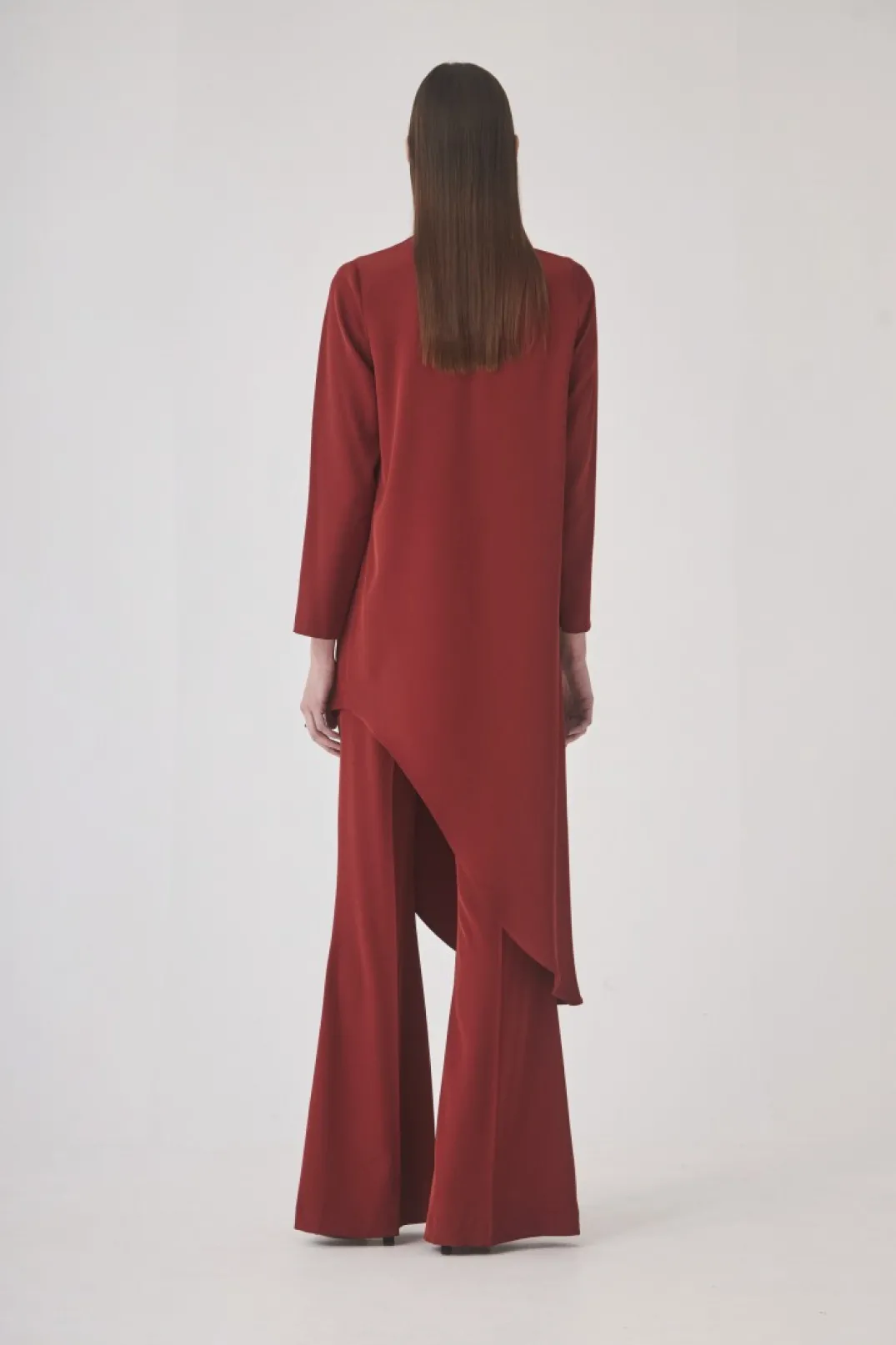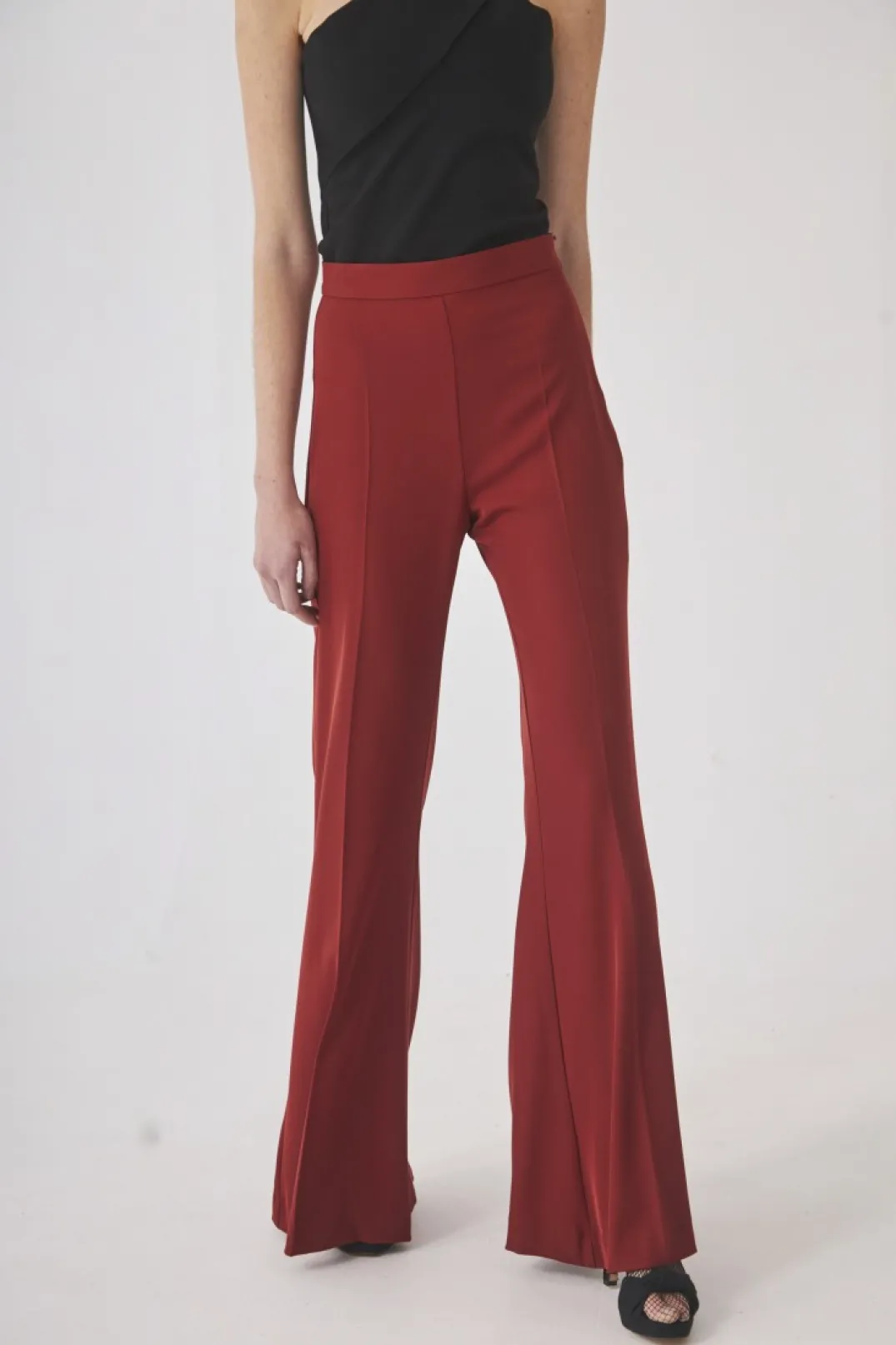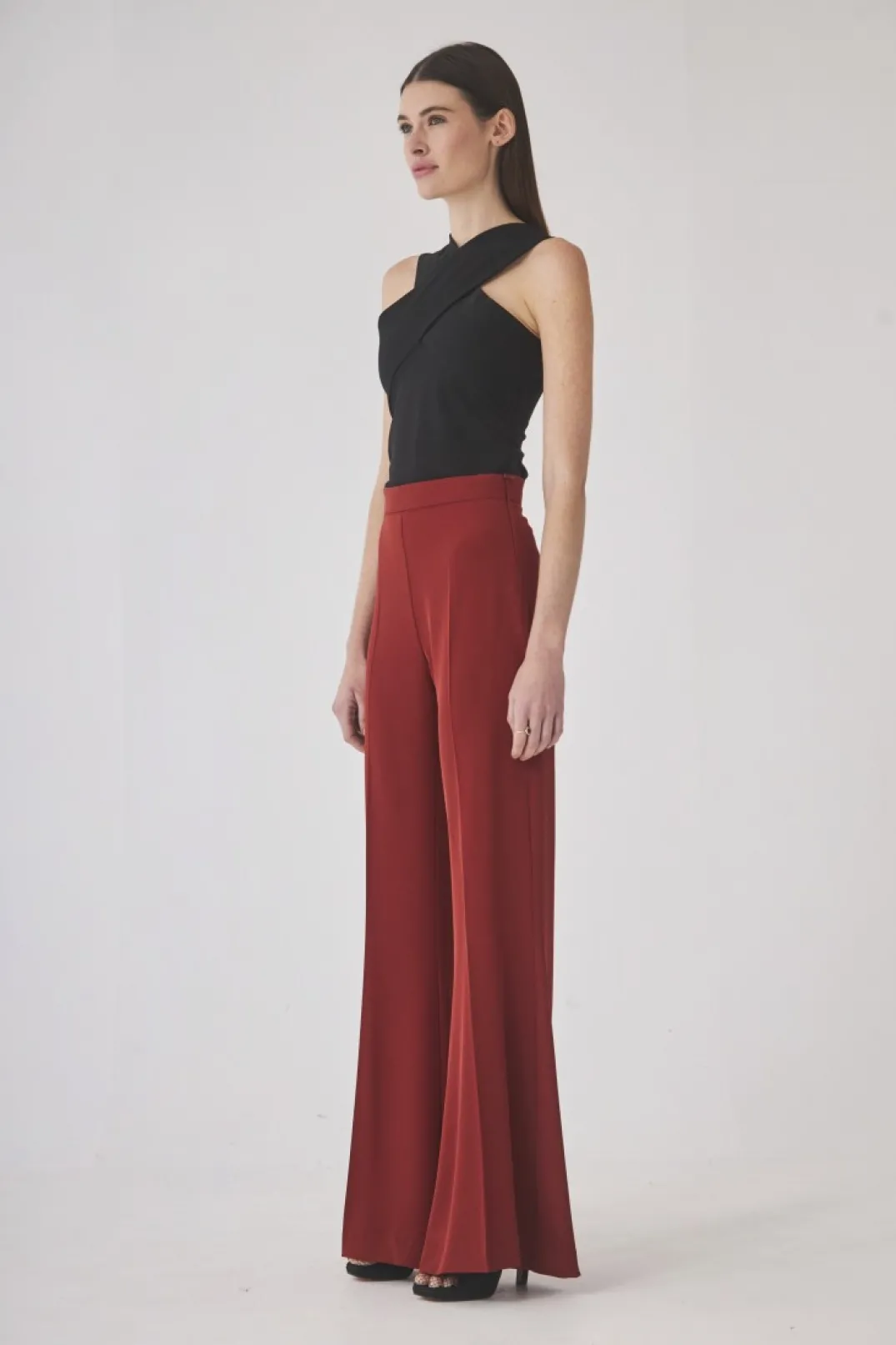 Pantalón de tiro alto estilo palazzo confeccionado en crepe teja con corte fluido.