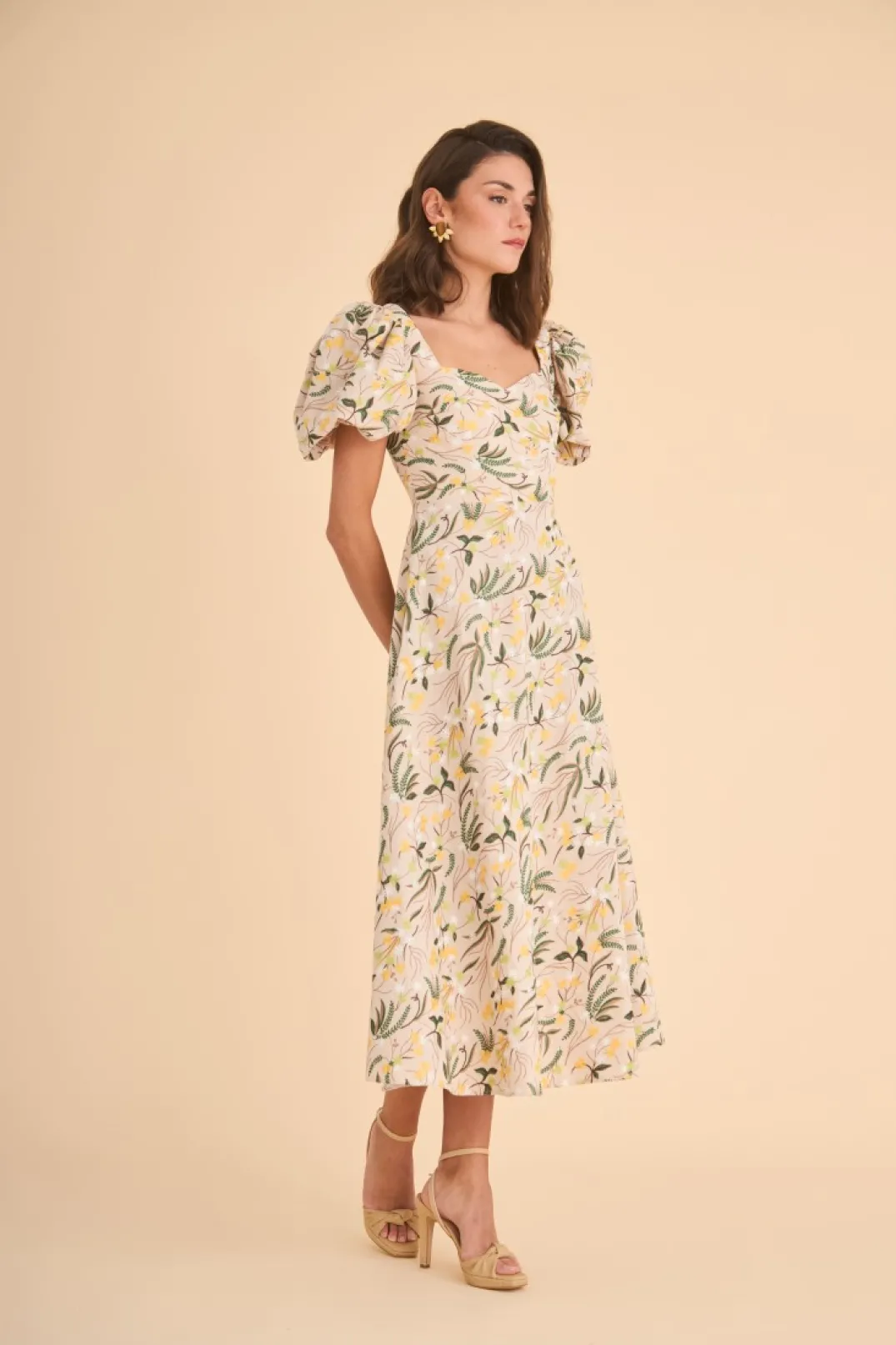 Vestido confeccionado en algodón bordado con motivos florales. Escote en forma de corazón y manga corta abullonada con elástico. Corte en la cintura y falda de largo midi fluida. Cierre con cremallera invisible