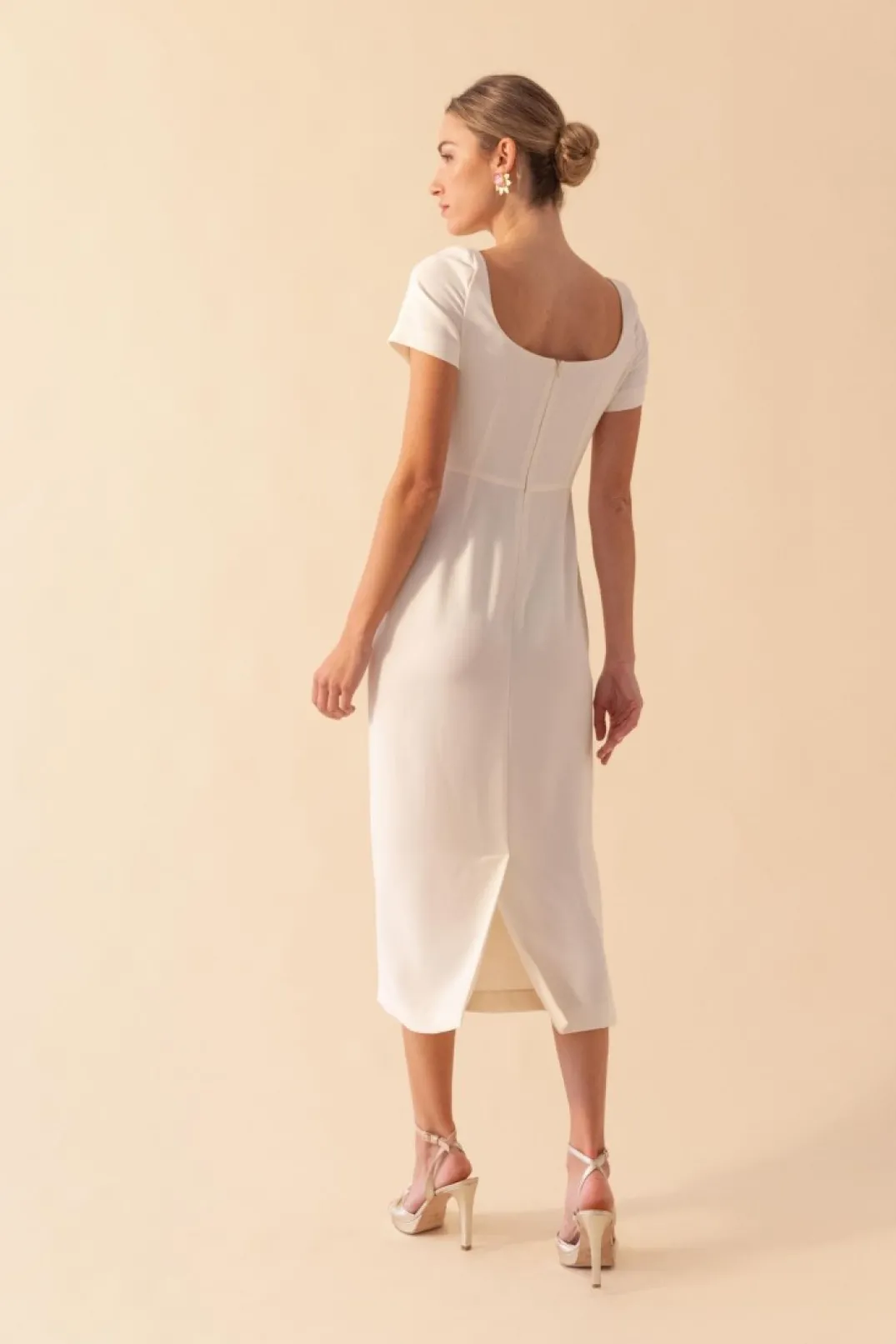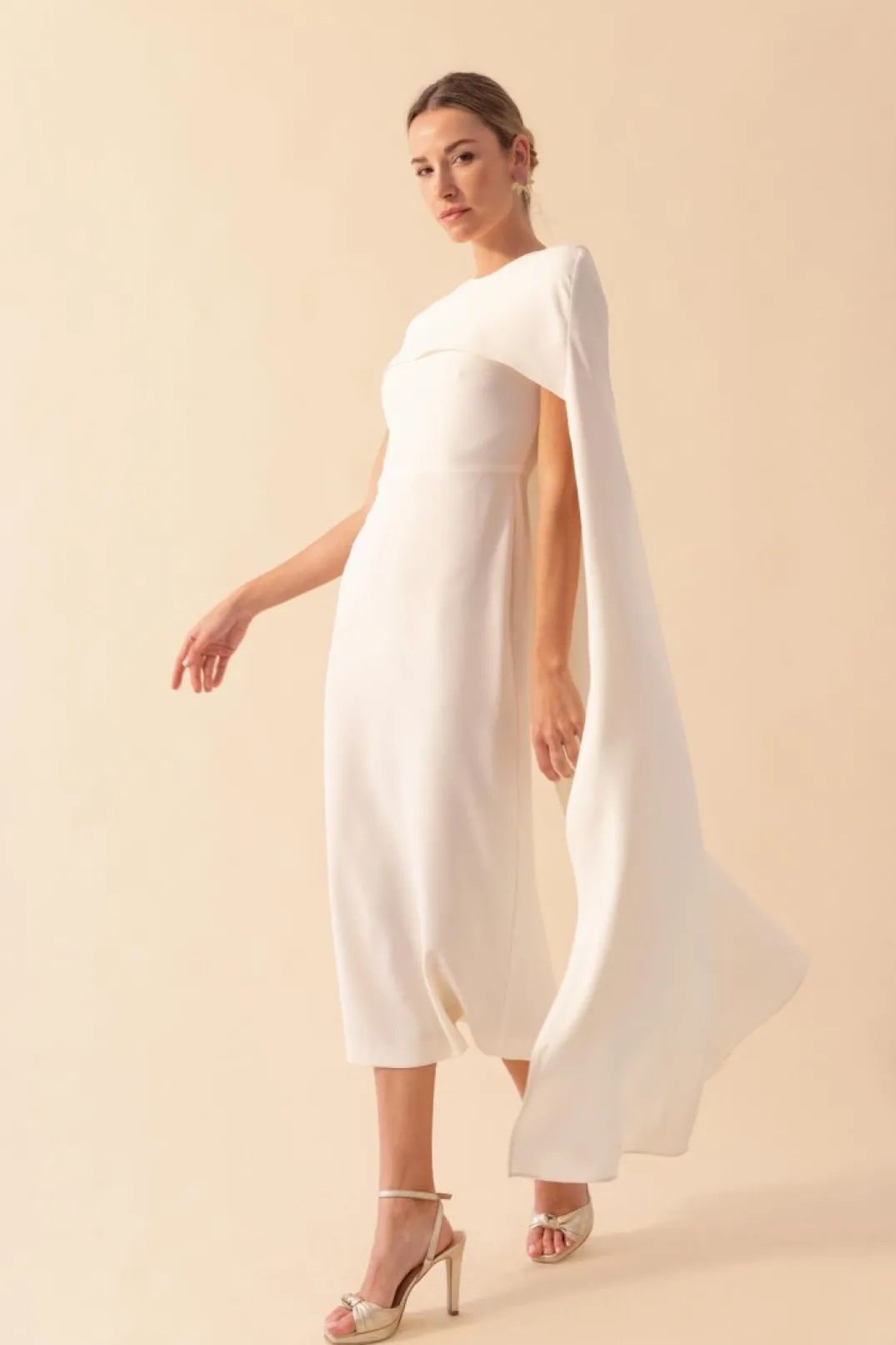 Vestido confeccionado en crepe blanco. Escote barco y manga corta. Corte en la cintura y falda recta con abertura trasera. Incluye capa en el mismo tono.