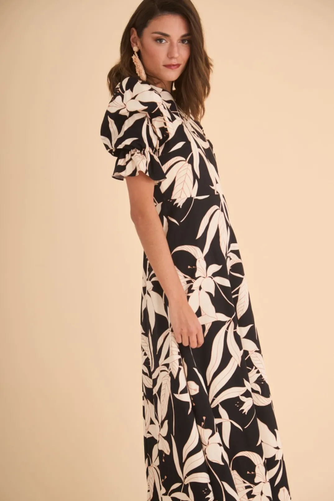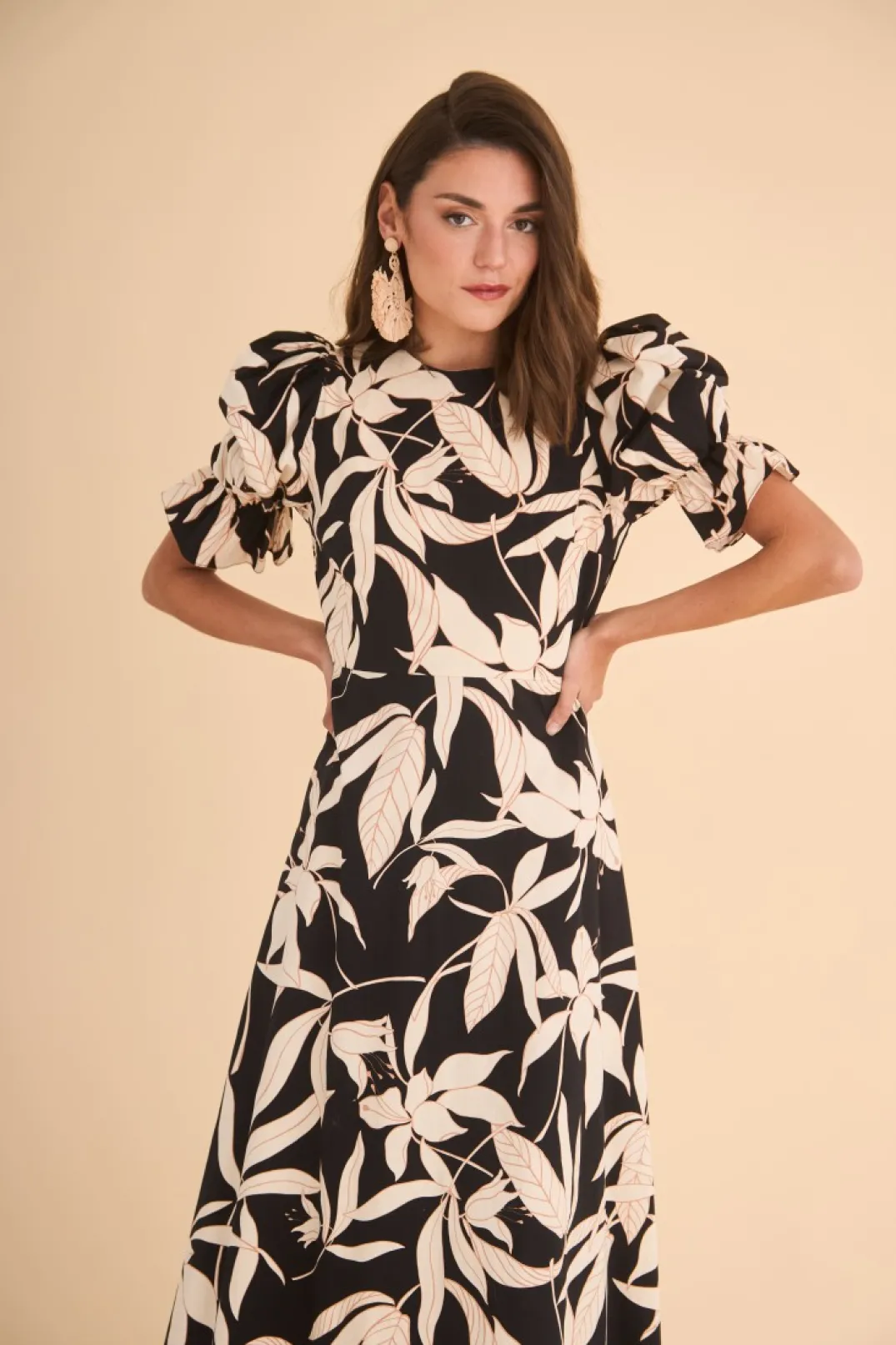 Vestido de fiesta confeccionado en tejido de algodón estampado en tono negro y crudo. Cuello redondo y manga corta abullonada. Corte en la cintura y largo midi con vuelo. Cierre trasero con botones forrados a tono. Perfecto para combinar con accesorios dorados, ¡nos encanta!