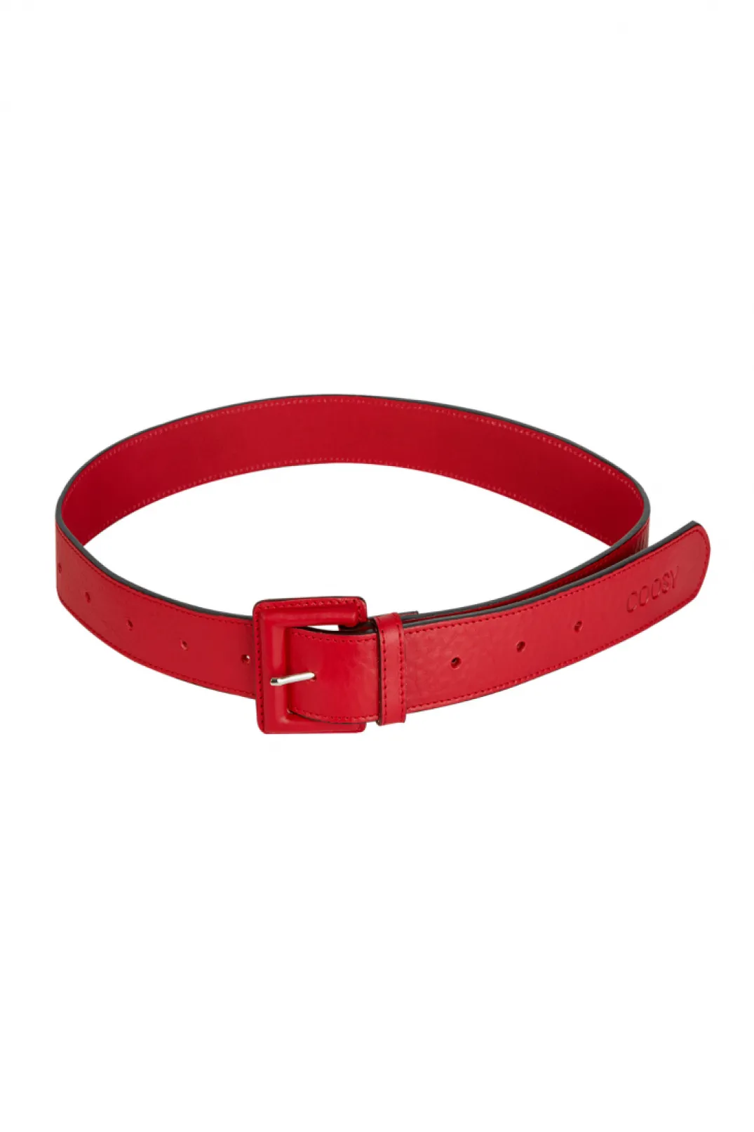 Cinturón confeccionado en piel color rojo. Cierre delantero con hebilla forrada en piel. Incluye el logo de Coosy grab…