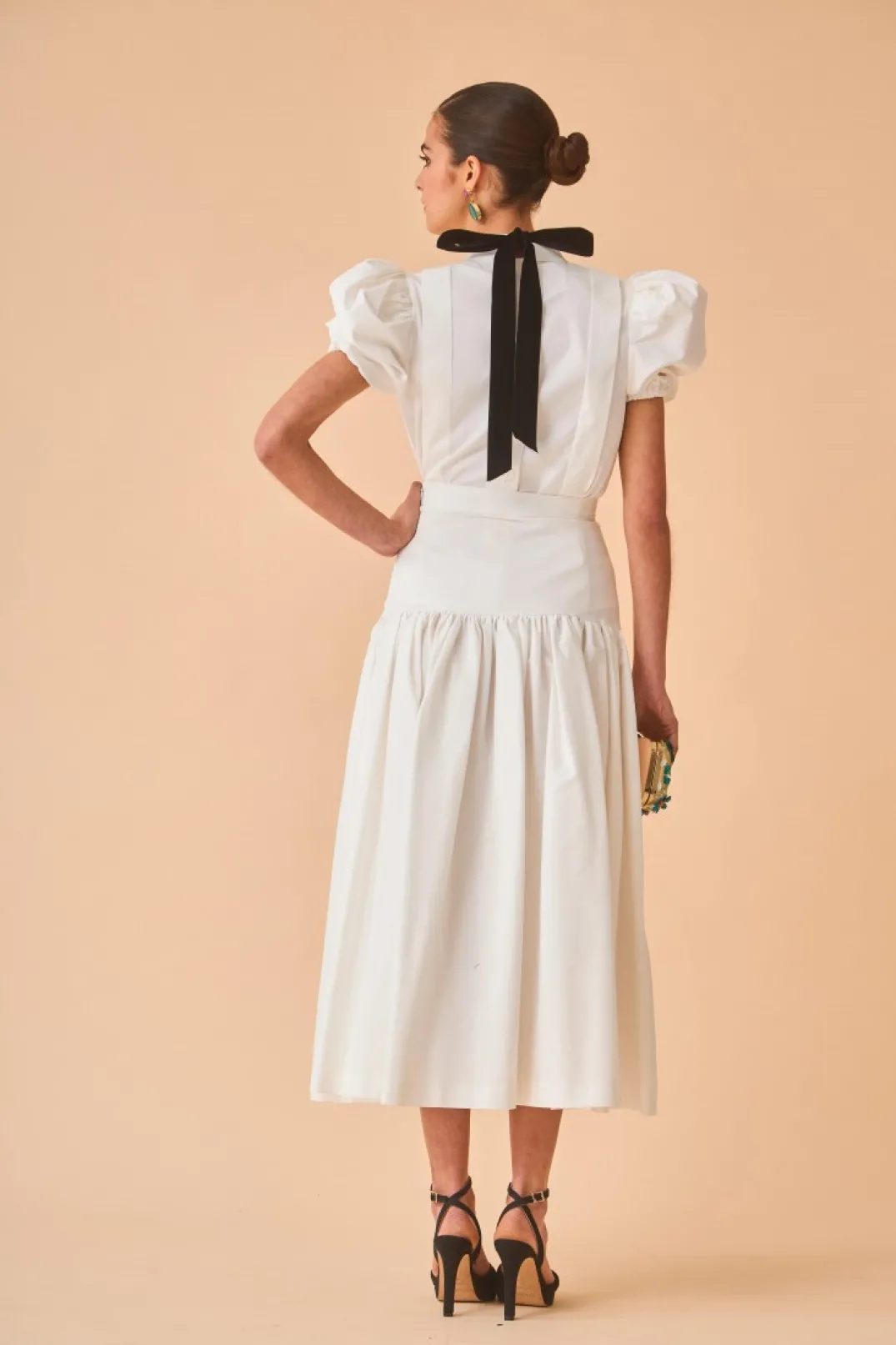 Top confeccionado en algodón color blanco. Cuello perkins, solapas laterales y manga corta abullonada con elástico. Cierre trasero con botones y lazo de terciopelo en color negro.