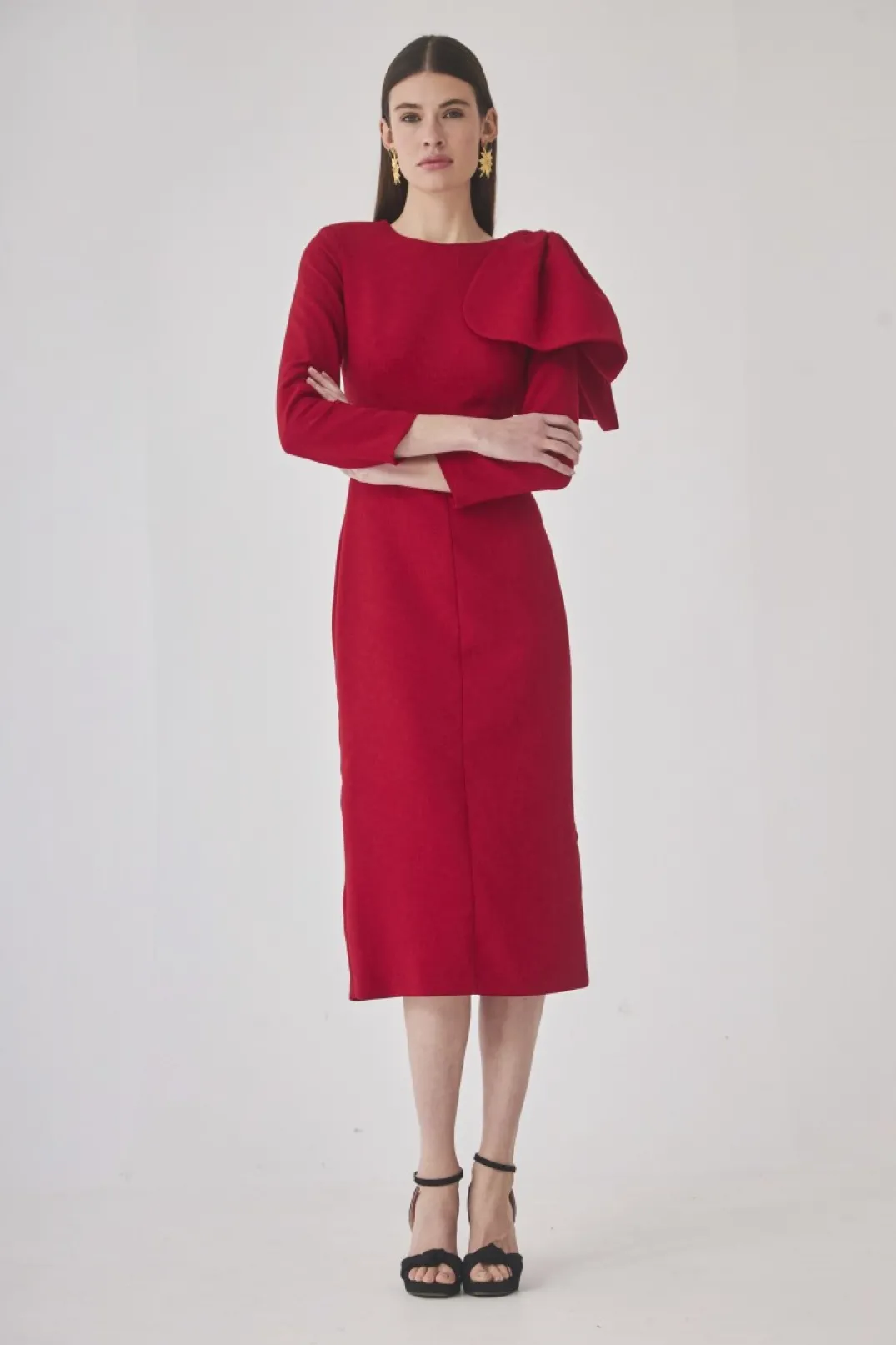 Vestido midi de fiesta confeccionado tejido color rojo. Escote redondo con detalle de lazo confeccionado en el mismo tejido. Fruncido a la cintura y manga larga abullonada. Falda midi ajustada con abertura trasera. Cierre con cremallera invisible
