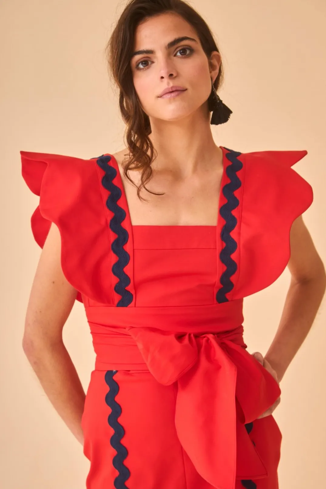 Top confeccionado en tejido color rojo. Escote cuadrado, sin manga y maxi solapas a modo de hombrera. Incluye detalle de piconela a contraste en color azul marino oscuro. Escote en pico en espalda y cierre con maxi lazada multiposición.