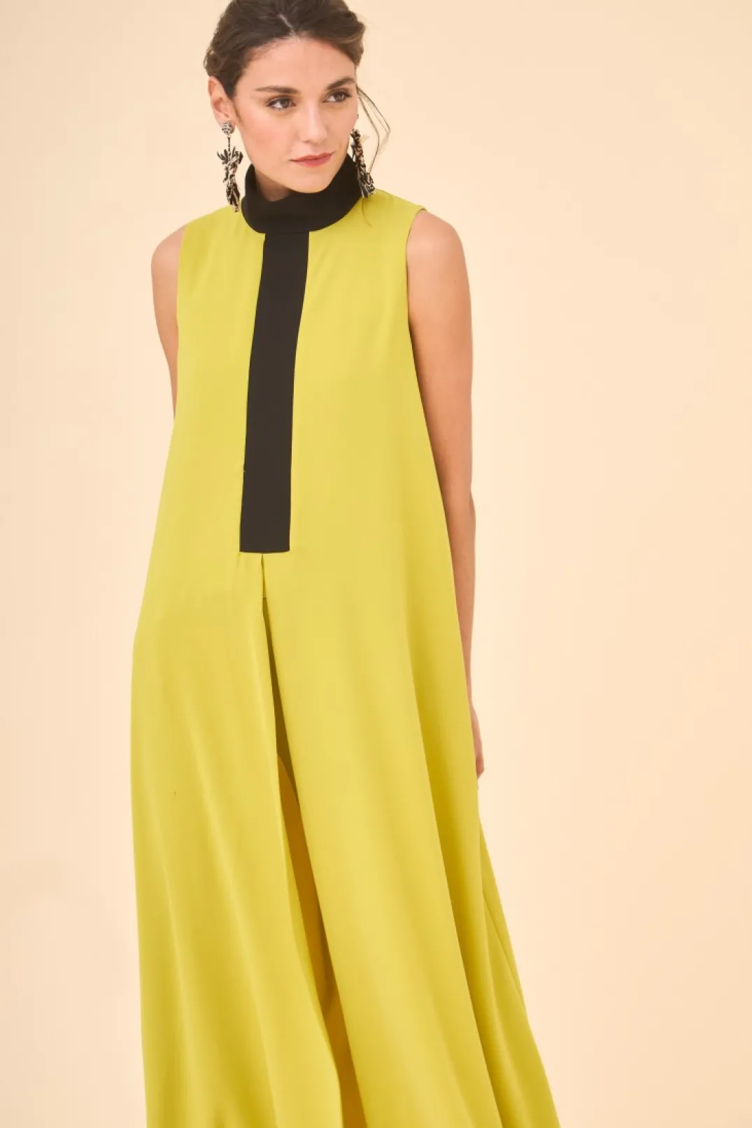 Top largo confeccionado en crepe oliva. Cuello alto y detalle en el pecho a contraste confeccionado en el mismo tejido en color negro. Sin mangas, largo asimétrico y abertura delantera. Cierre con cremallera invisible trasera.