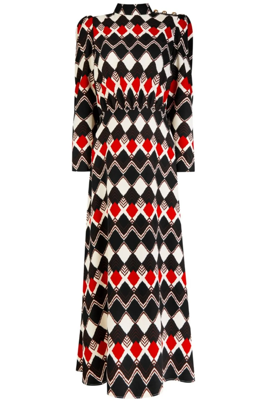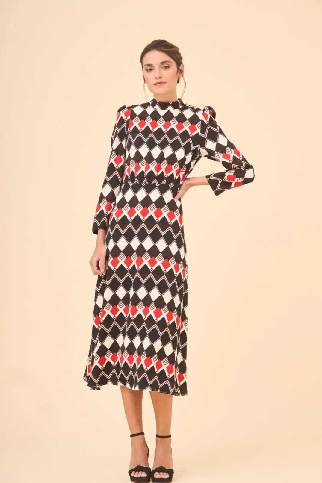 Vestido midi confeccionado en tejido estampado de rombos. Cuello subido y manga larga. Detalle de botones dorados en el hombro. Cuerpo fruncido y falda midi con vuelo.