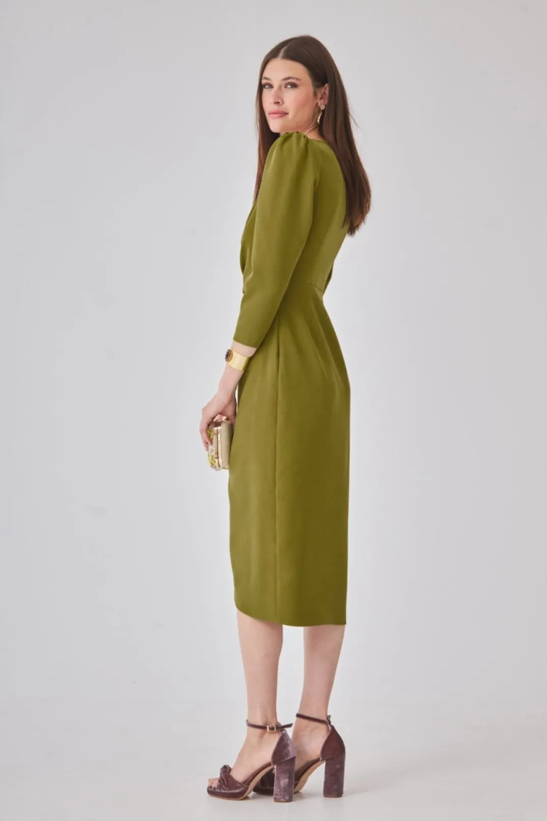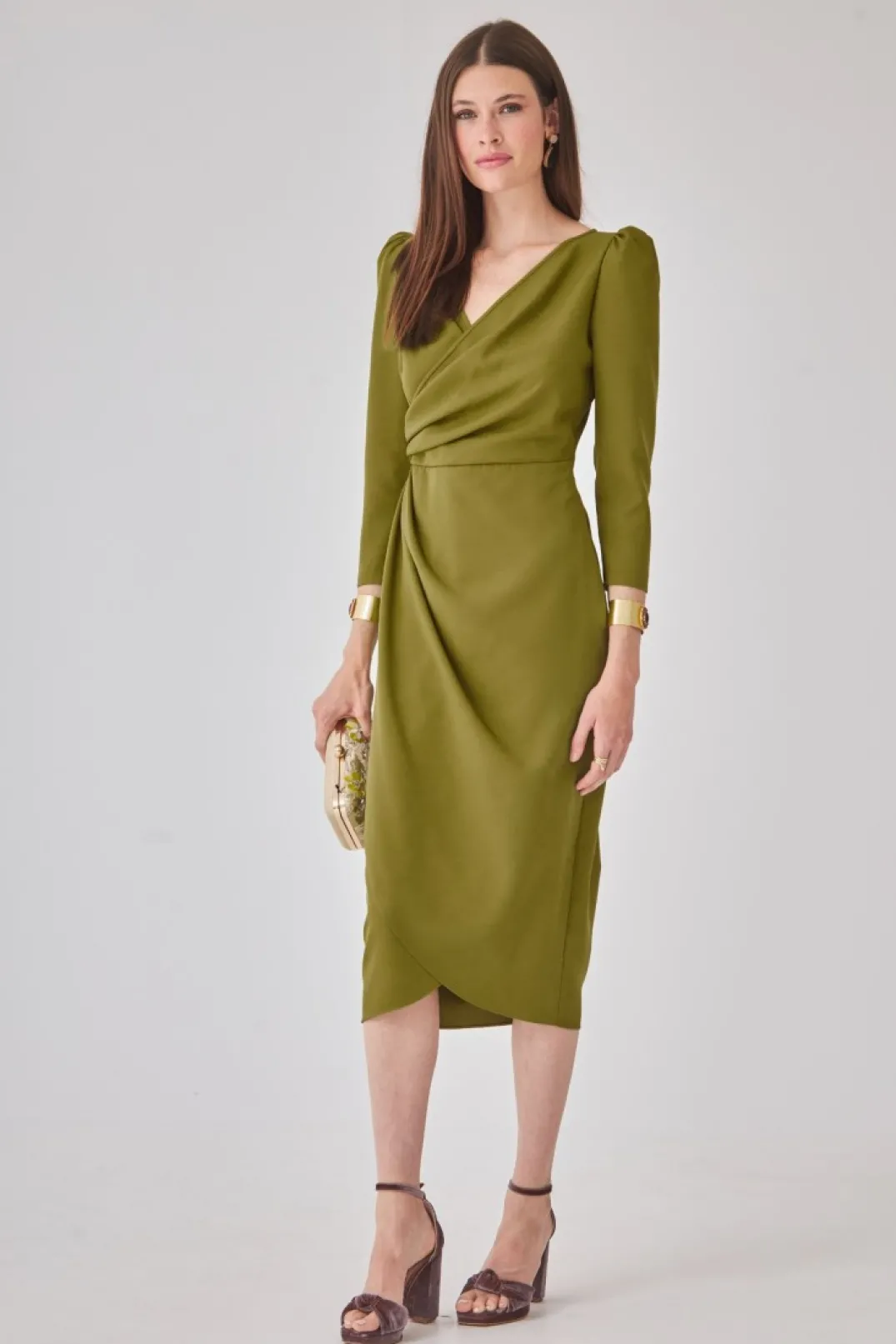 Vestido midi de fiesta confeccionado en crepe verde oliva. Escote cruzado terminado en drapeado a la cintura. Manga larga con hombreras.
