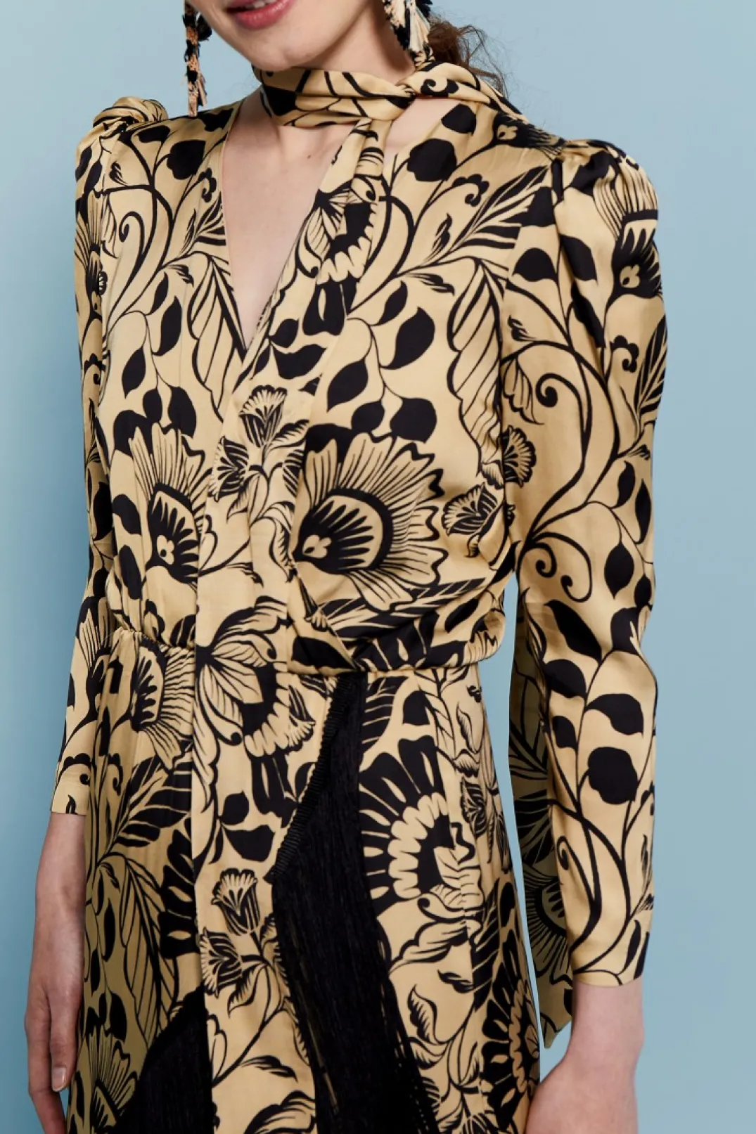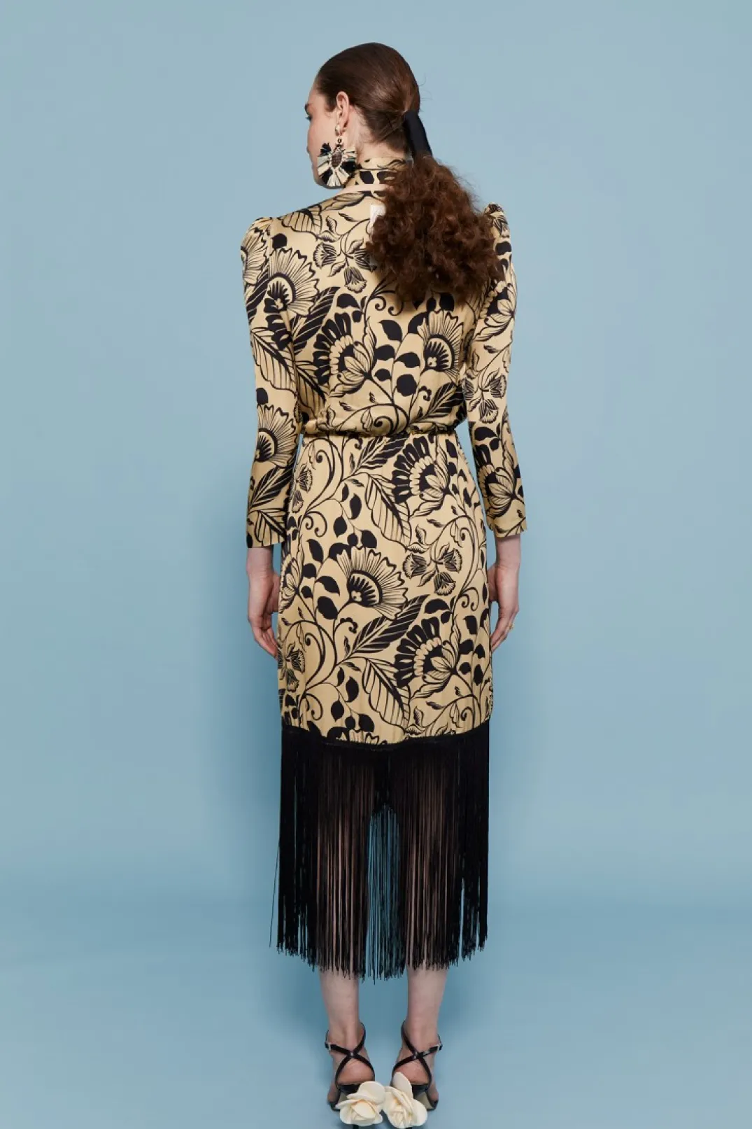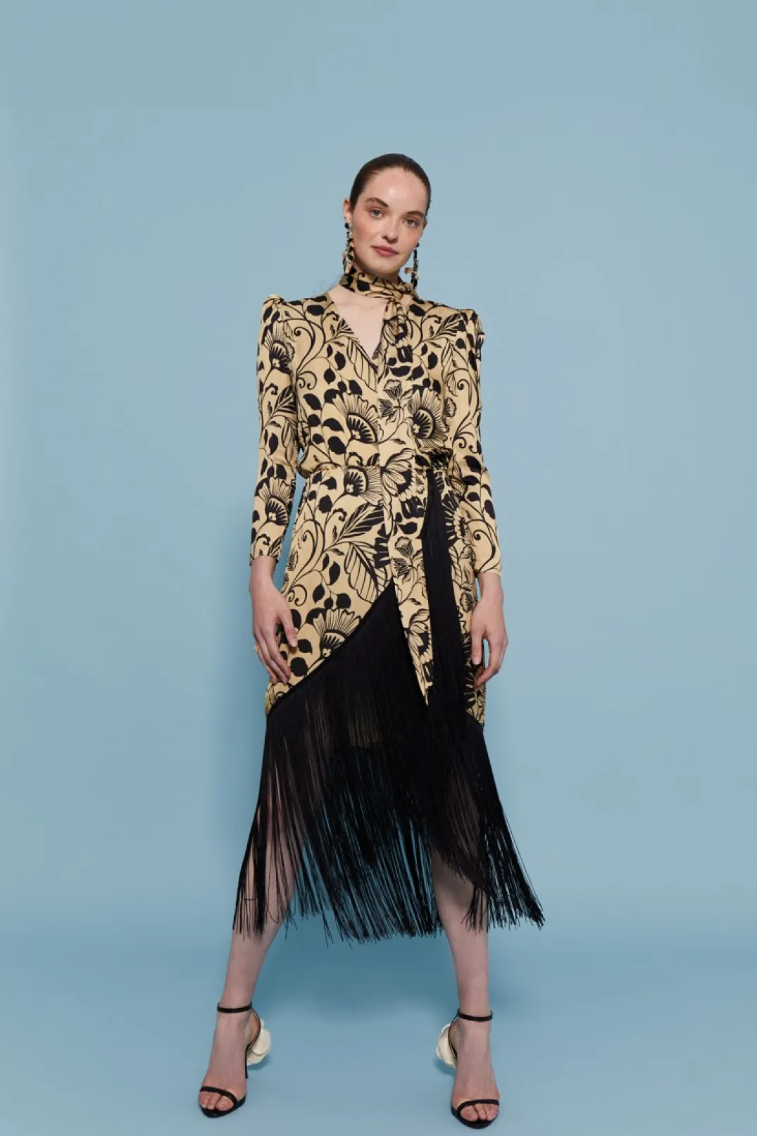 Vestido de fiesta confeccionado en satén estampado. Escote en pico cruzado con forro interior. Manga larga abullonada. Corte en la cintura y falda estilo tulipa con flecos en color negro a contraste.
