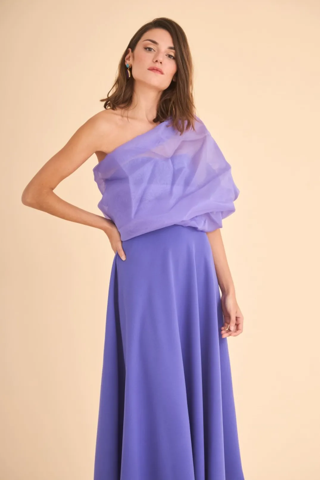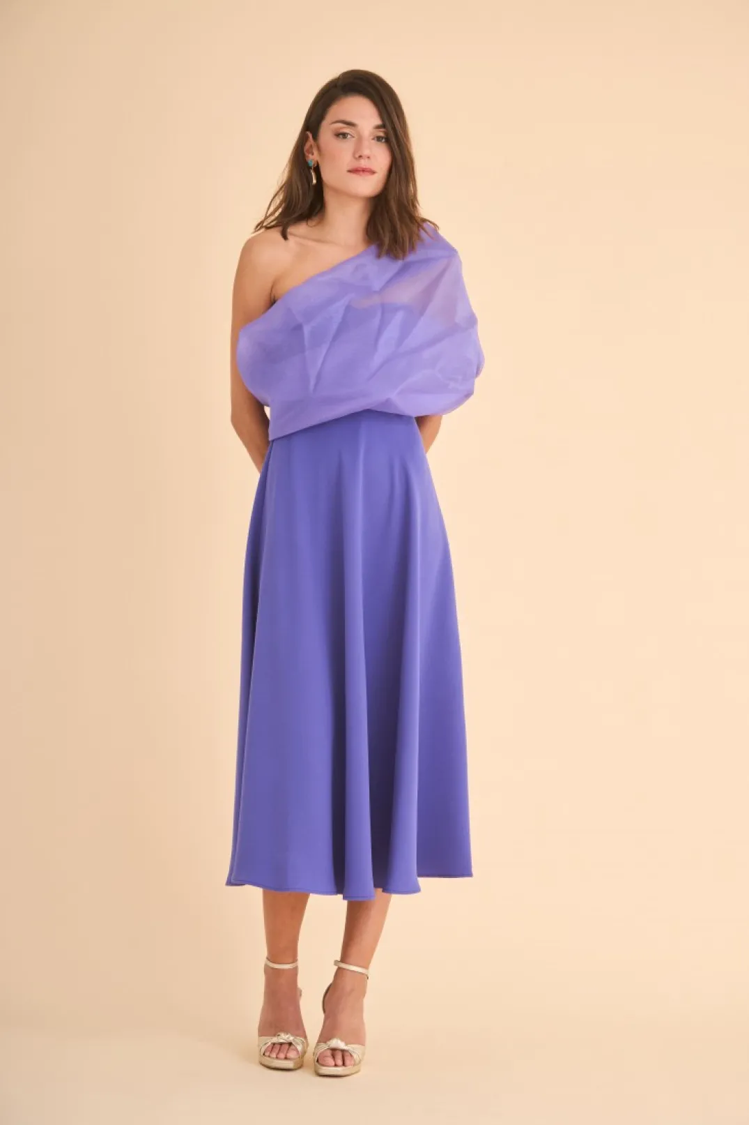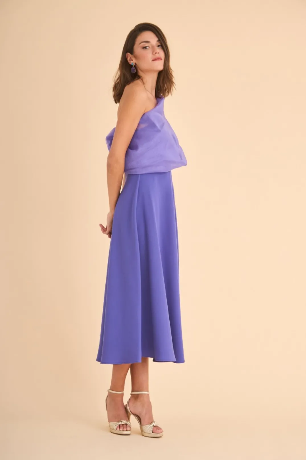 Vestido confeccionado en crepe color morado. Escote palabra de honor. Corte en la cintura y largo midi con falda fluida.