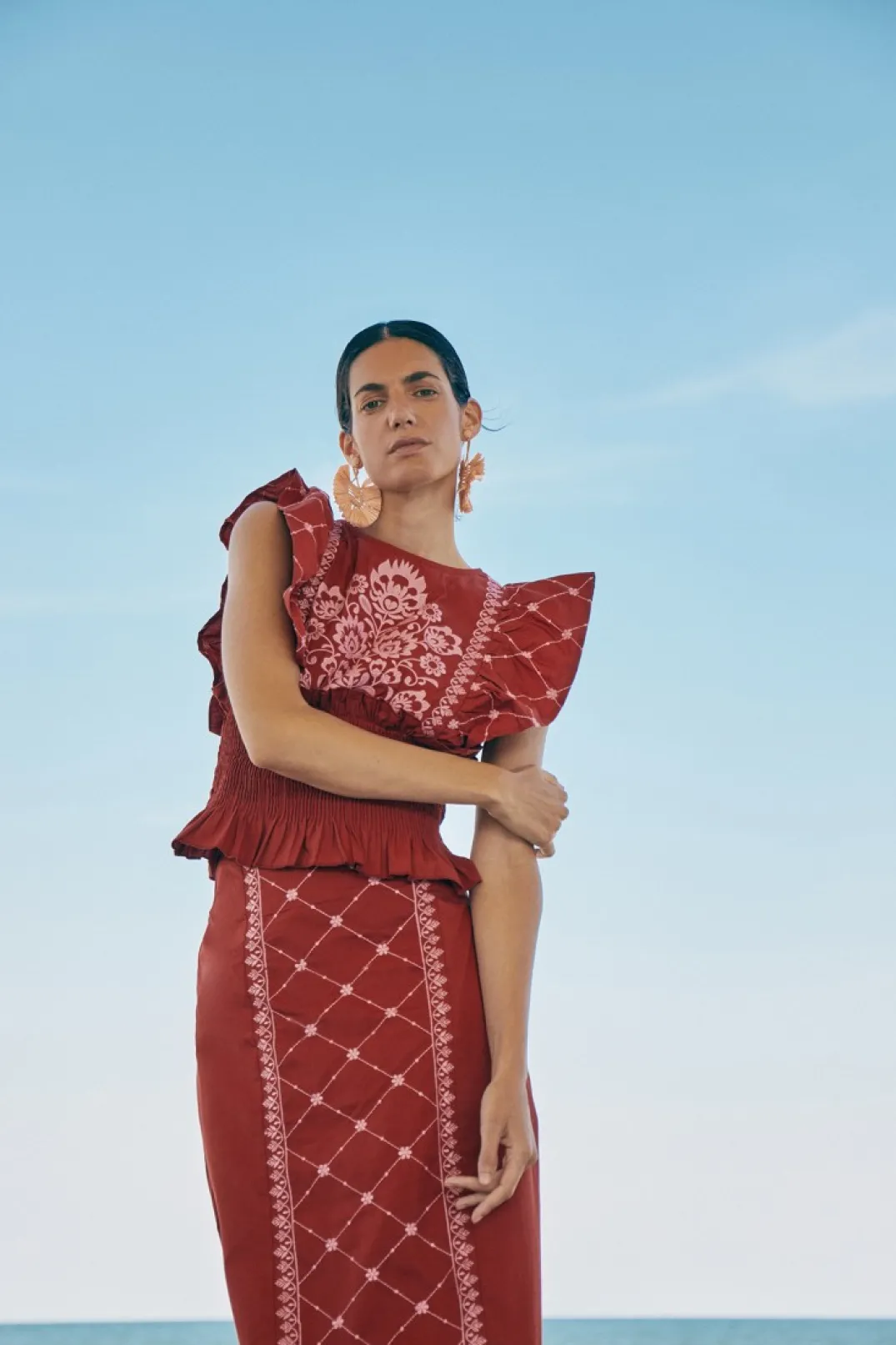 Conjunto de top y falda confeccionado en algodón color granate con bordados estilo étnicos a contraste en color rosa. Top fruncido en la cintura con elástico y maxi volantes en los hombros. El top tiene un cierre trasero con botón.