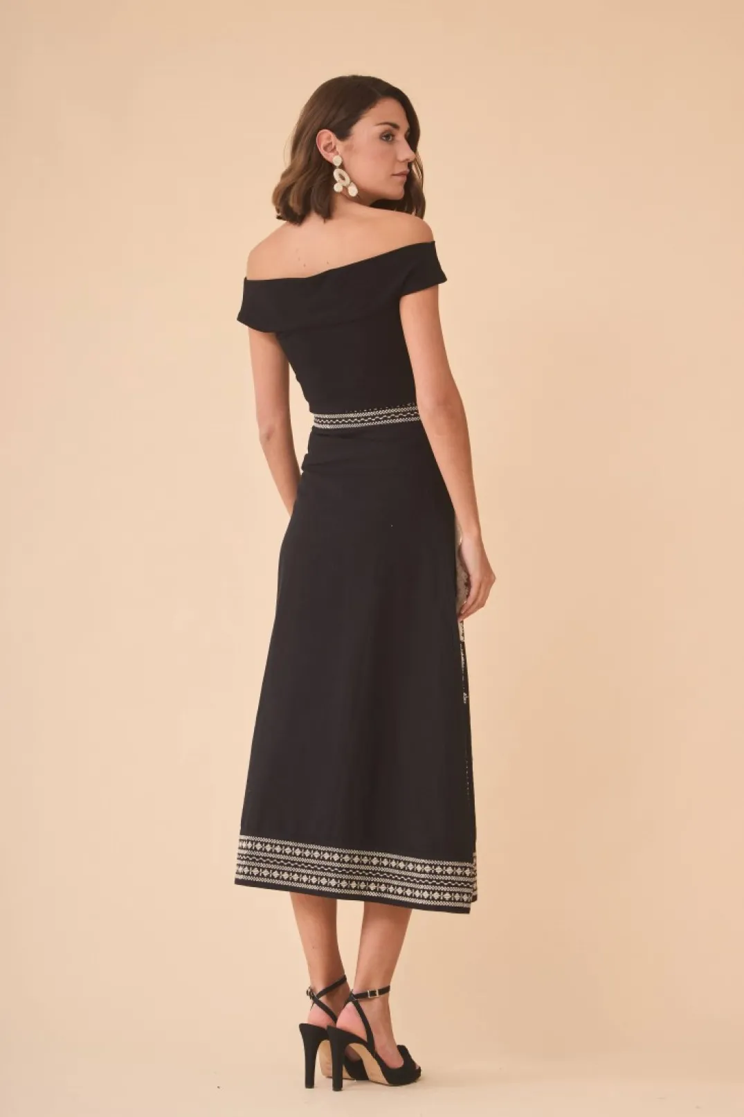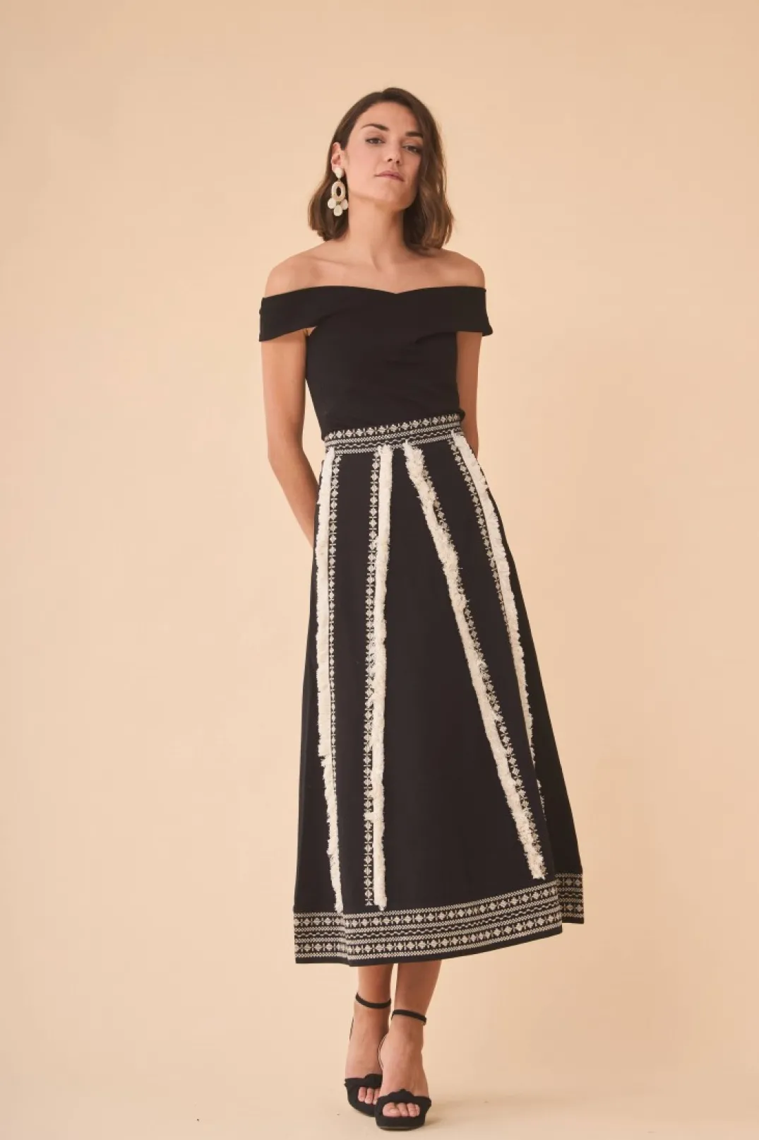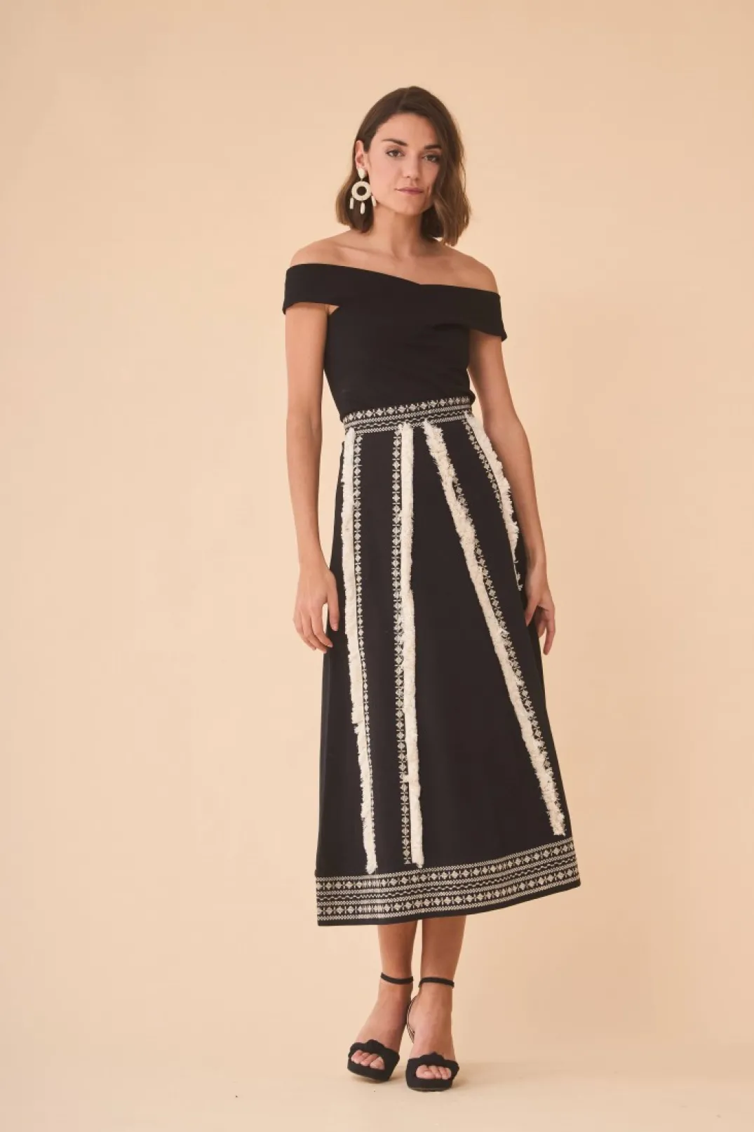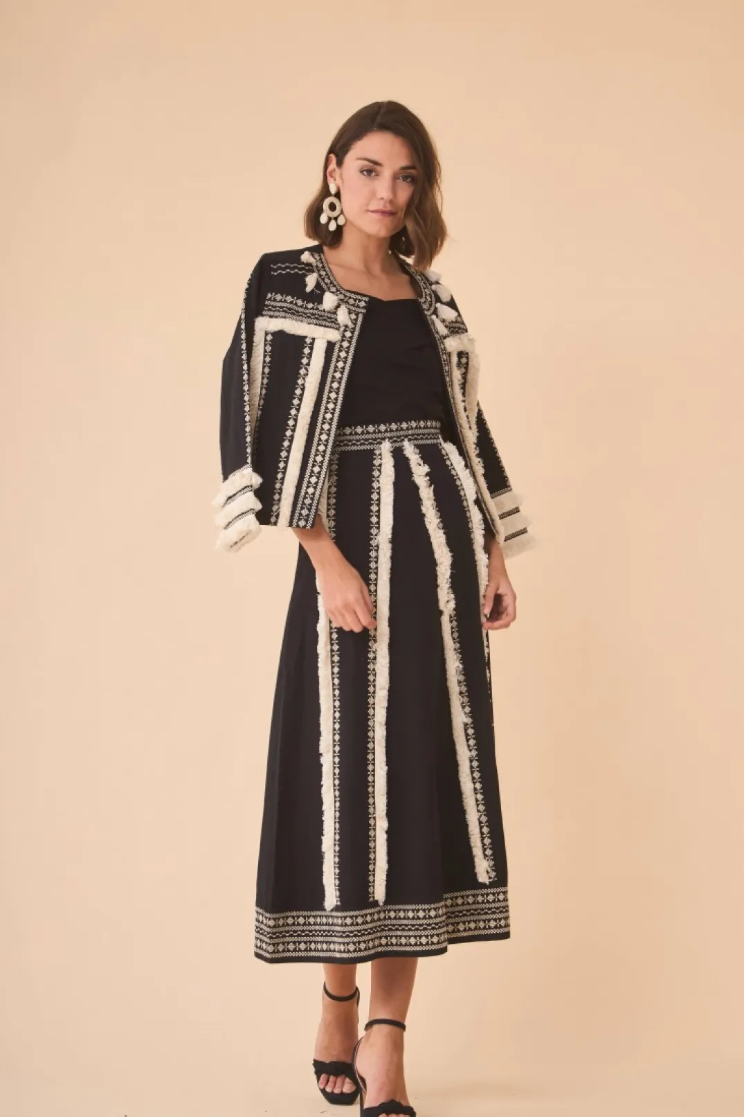 Falda midi de tiro alto confeccionada en algodón color negro. Detalle de flecos en la parte delantera y bordados en color beige en el bajo. Cierre con cremallera lateral invisible.