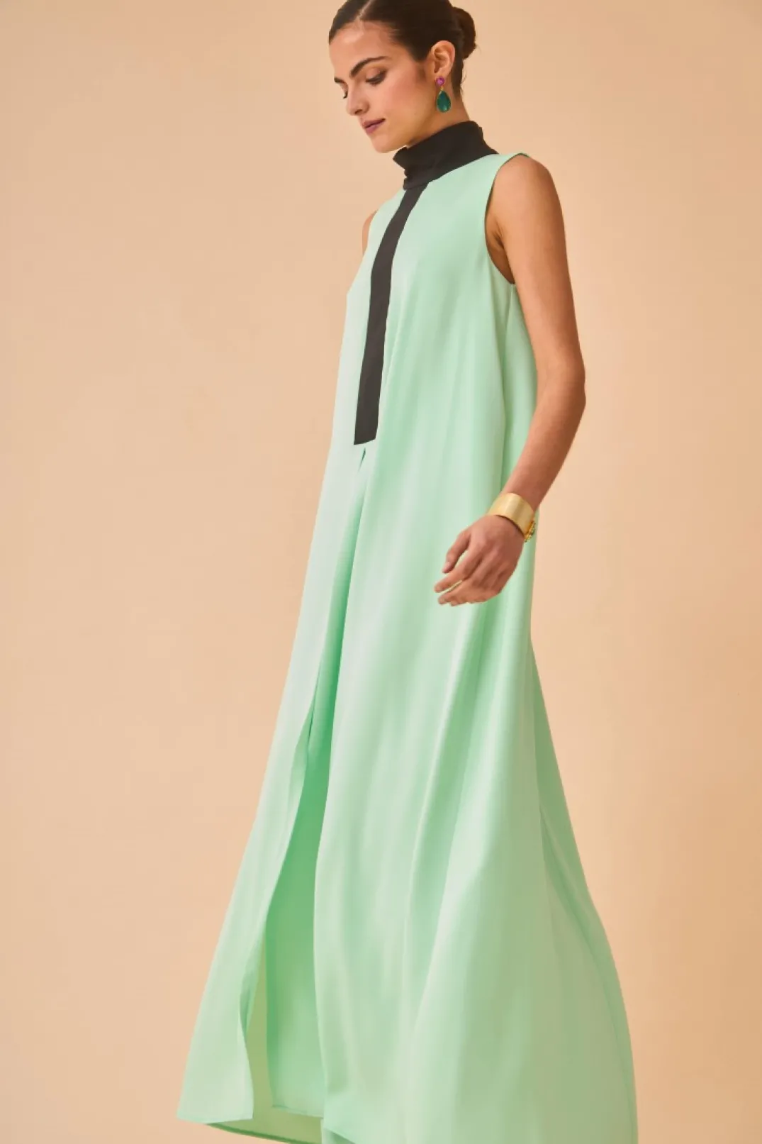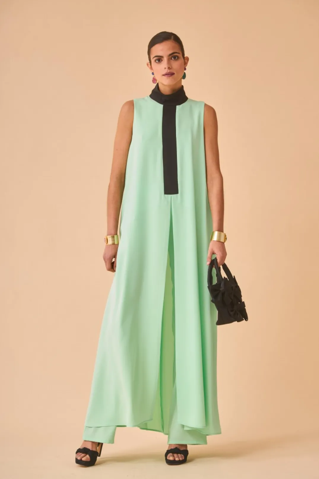 Top largo confeccionado en crepe aguamarina. Cuello alto y detalle en el pecho a contraste confeccionado en el mismo tejido en color negro. Sin mangas, largo asimétrico y abertura delantera. Cierre con cremallera invisible trasera.