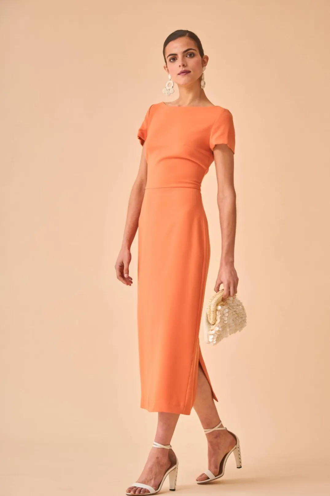 Vestido confeccionado en crepe naranja. Escote barco y manga corta. Corte en la cintura y falda recta con abertura trasera. Incluye capa en el mismo tono.