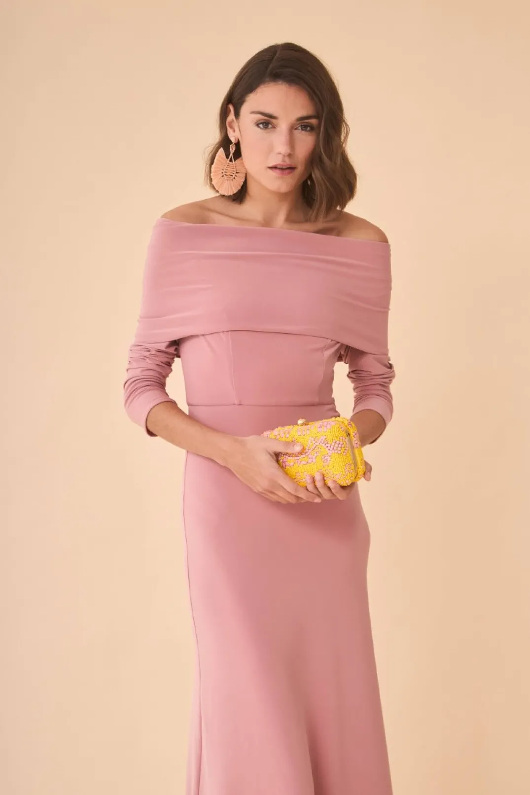 Vestido de fiesta midi confeccionado en tejido de punto color rosa. Corte en la cintura y falda fluida. Escote palabra de honor con manga larga.