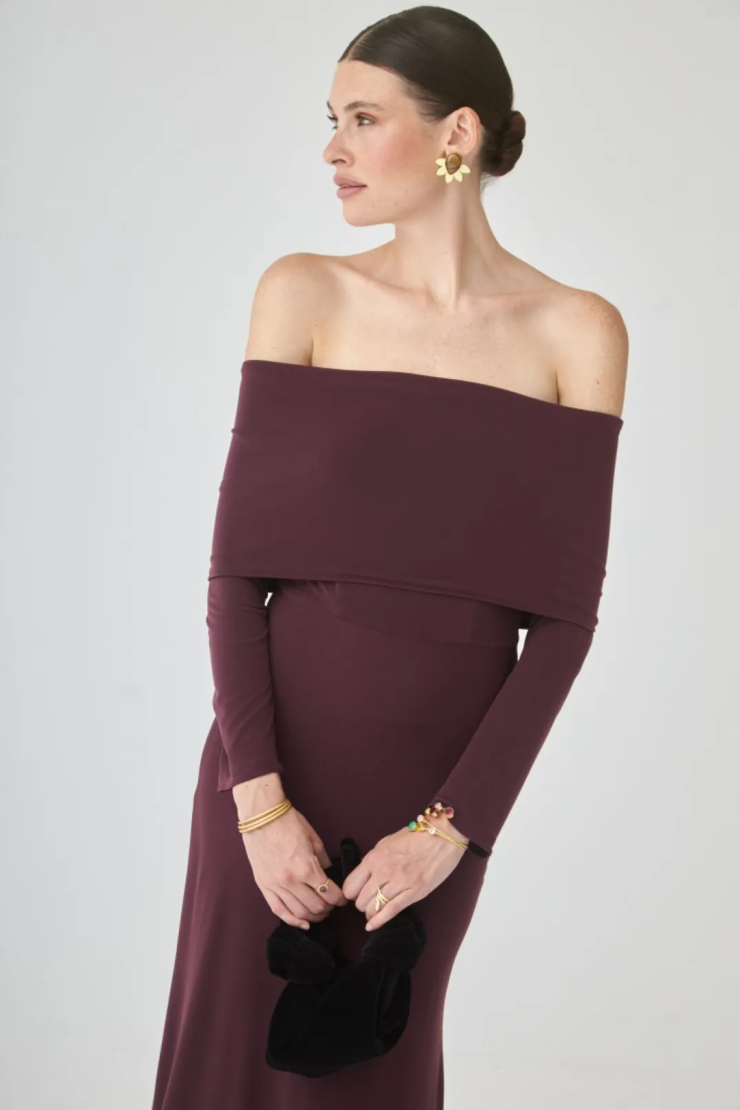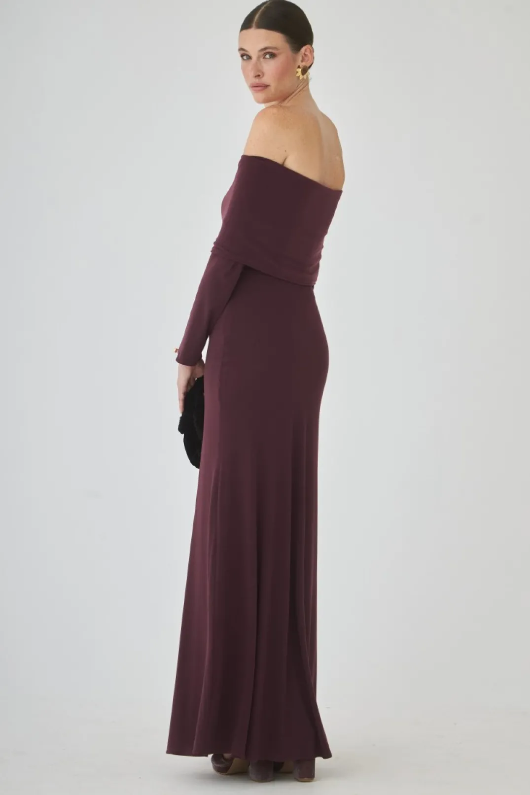 Vestido de fiesta largo confeccionado en tejido de punto color granate. Corte en la cintura y falda fluida. Escote palabra de honor con manga larga.
