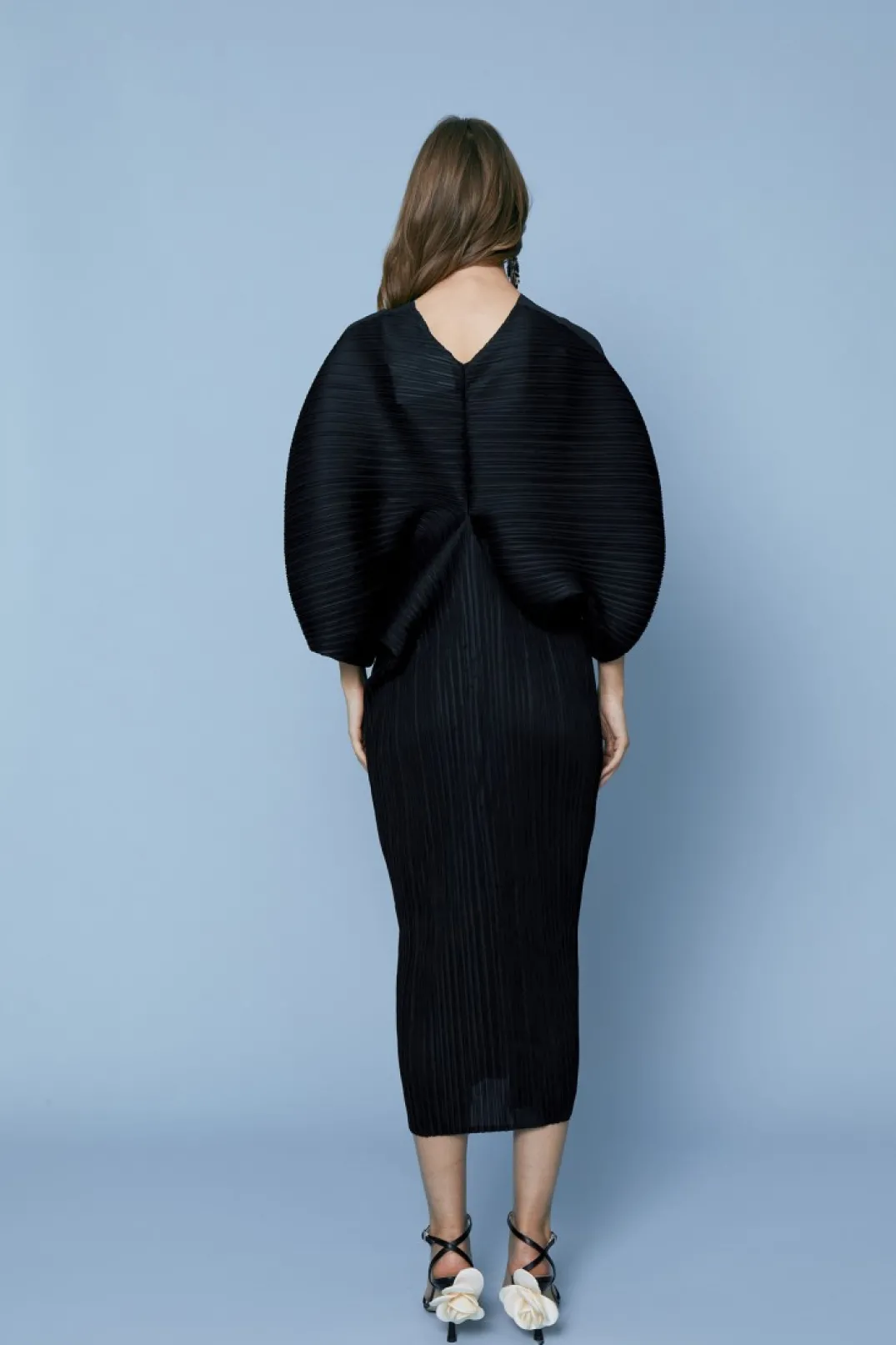 Vestido confeccionado en tejido plisado en color negro. Escote en pico y frunce en la cintura. Manga estructurada estilo murciélago. Corte en la cintura falda tubo.
